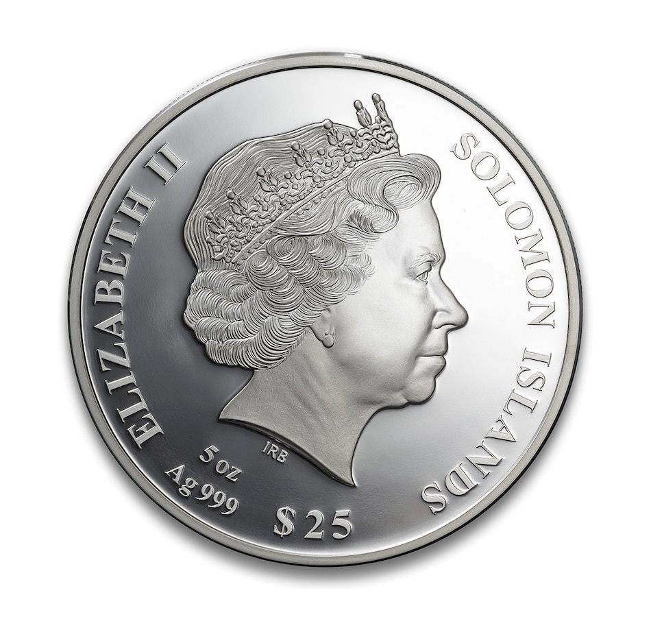 The main design depicts the unforgettable maiden voyage of the Titanic 110 years ago, which was also the ship's final voyage. On top of the mother of pearl inlay are the coordinates of the RMS Titanic. The obverse of the coin features the effigy of Her Majesty Queen Elizabeth II and the inscriptions "Solomon Islands," "2022," "5 oz Ag 999," and "Elizabeth II."