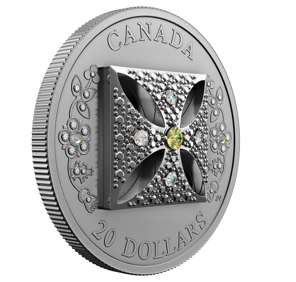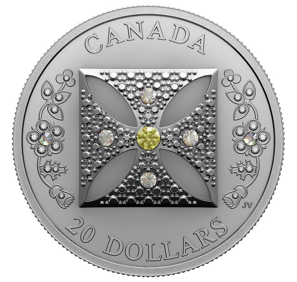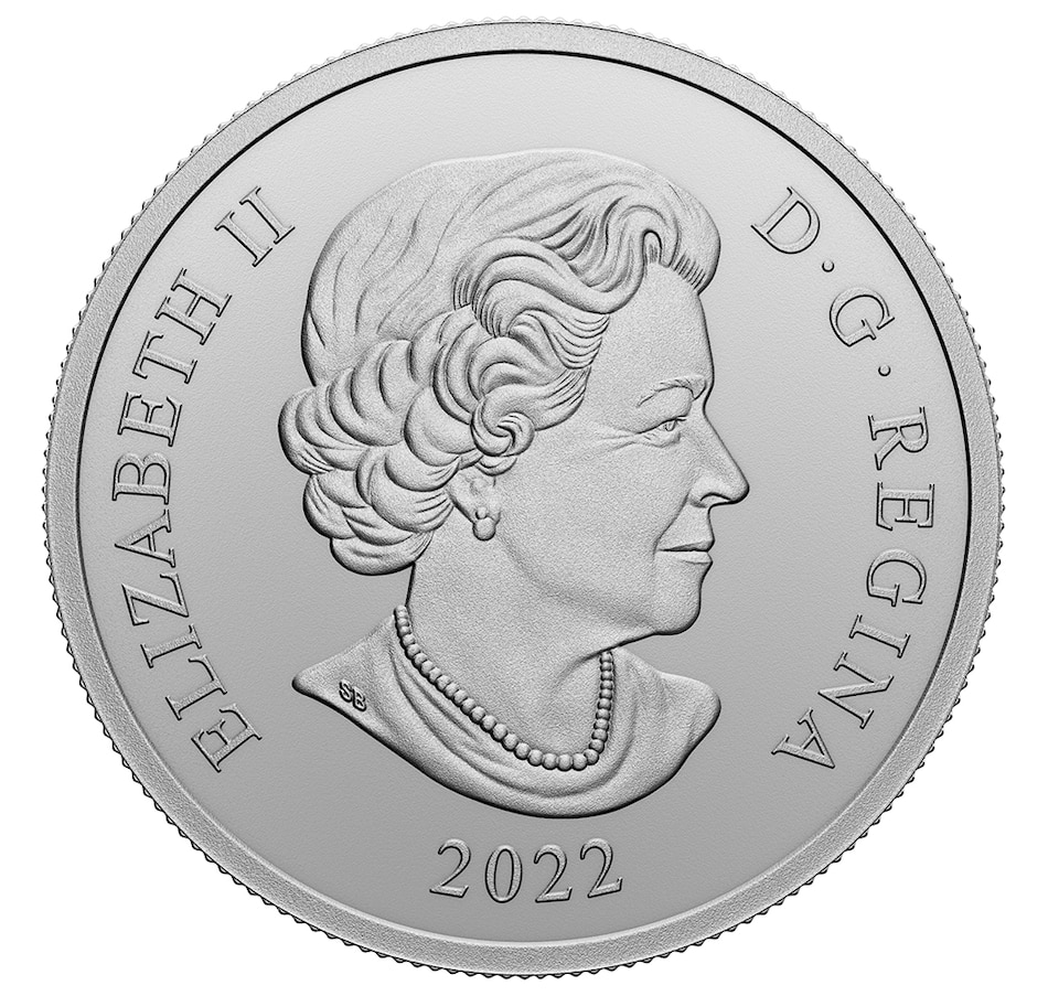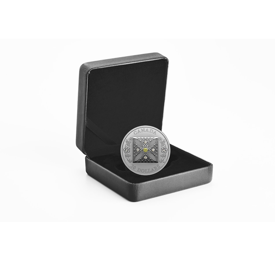 This 2022 one-ounce fine silver coin pays tribute to the 70th year of reign of Her Majesty Queen Elizabeth. The design features the iconic monarch's diamond diadem, the royal headpiece that has appeared in countless portraits since Her Majesty acceded to the throne in 1952. Swarovski crystals add a diamond-like sparkle to the rhodium-plated embellishment, which resembles the diadem's cross and the floral sprays representing the national emblems of England, Ireland and Scotland. The reverse includes the inscription "Canada" at the top and "20 dollars" at the bottom. The obverse features the date "2022" and the effigy of Her Majesty Queen Elizabeth II by Susanna Blunt.