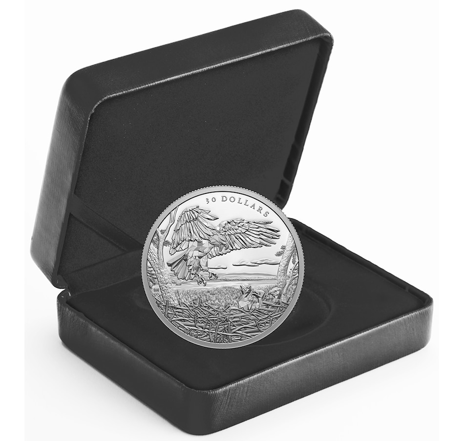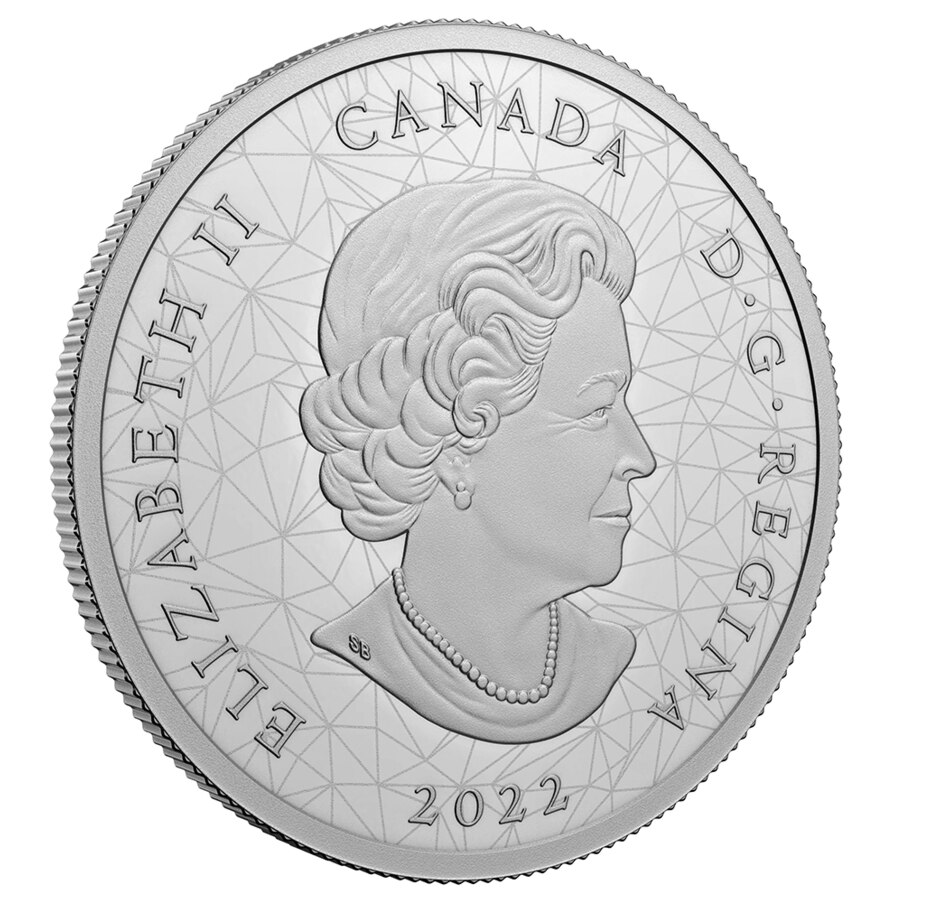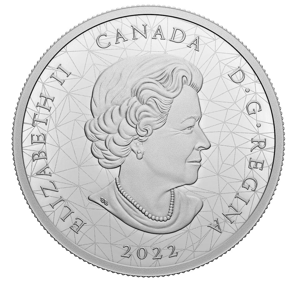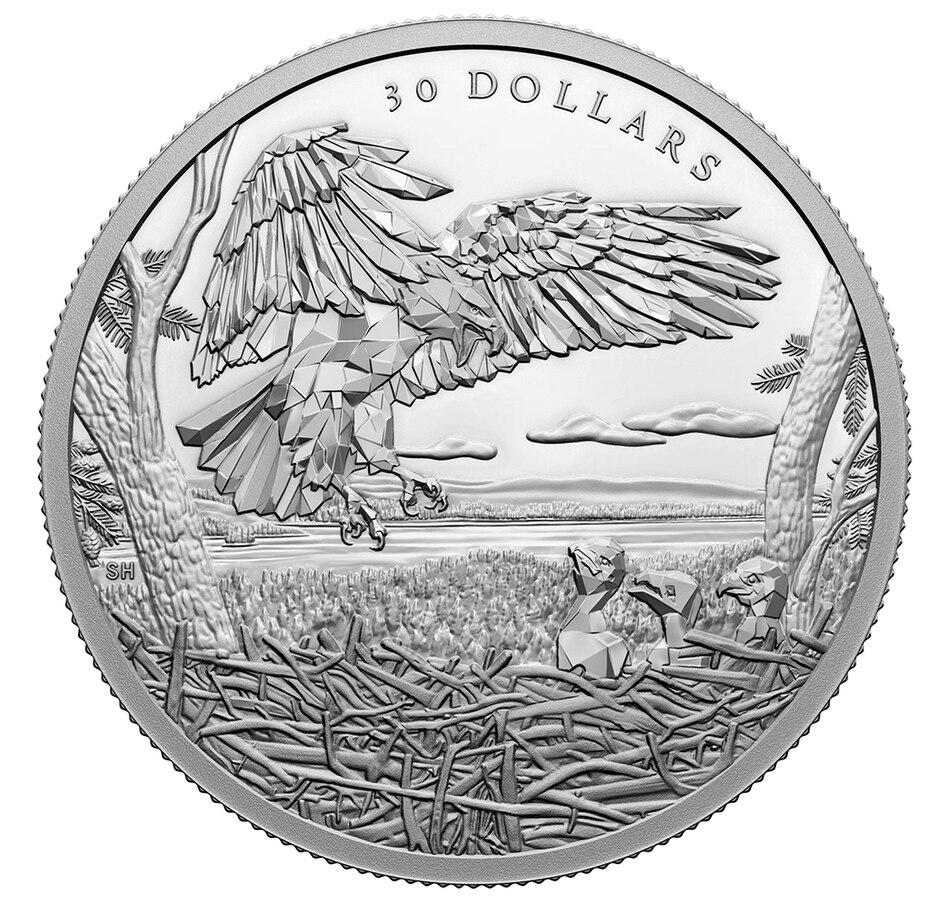 This 2022 $30 fine silver coin provides a rare glimpse of a bald eagle family. Using a large-format two-ounce fine silver palette, the artistic design uses multi-faceted elements to represent motion as the mother eagle returns to the nest where three hungry eaglets anxiously await. Whether soaring in solitude or surveying from atop the tallest tree, the bald eagle is celebrated as a sharp-eyed symbol of strength. But the regal raptor can be surprisingly tender—it provides nourishment and models behaviours for its young to ensure that the next generation survives and thrives. The obverse of this coin features a polygon pattern and the effigy of Her Majesty Queen Elizabeth II by Susanna Blunt.