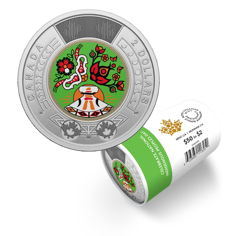 Canada's newest two-dollar commemorative coin celebrates First Nations, Inuit and Métis art and cultures and marks National Indigenous Peoples Day. This special collector-issue wrapped roll contains 25 brilliant uncirculated commemorative two-dollar coins, all with a full-colour enhanced centre design. Mintage is limited to 20,000 rolls for this colour version.