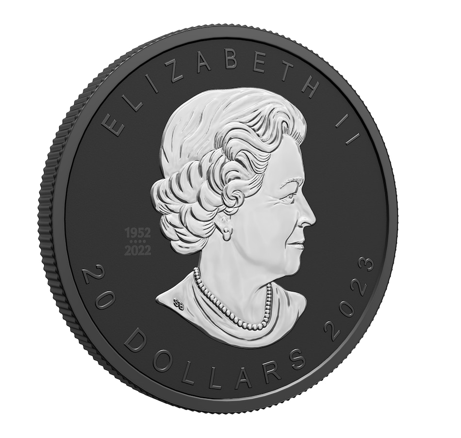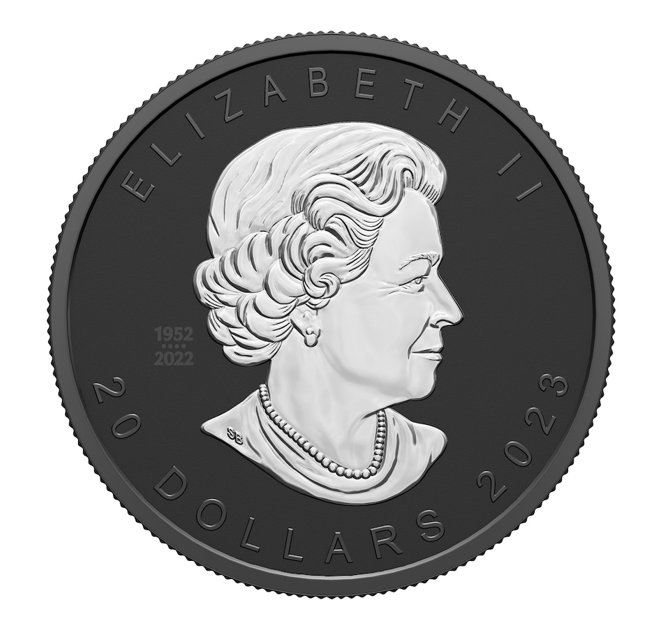 The coin's reverse features Walter Ott's iconic sugar maple leaf design, now transformed into a deep impression in the coin while maintaining all of the ultra-fine details. The design also includes the engraved words "Canada" and "fine silver 1 oz argent pur," as well as the purity standard of "9999." The obverse features the posthumous memorial effigy of Her Majesty Queen Elizabeth II by Susanna Blunt, plus the $20 denomination, the 2023 date and the dates of reign, 1952–2022.