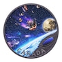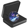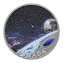 Designed by Canadian artist Neil Hamelin, the coin features a colourful space view of Pingualuit Crater Lake on the Ungava Peninsula, in Nunavik, Quebec. Above the blue circular lake and its (engraved) surroundings, the detailed depiction of the moon, shooting stars and the Milky Way inspire awe for the wonders of the cosmos, and a deeper understanding of both the splendour and vulnerability of Earth. These elements glow when viewed under black light, which reveals a second image: a view of the meteorite on its collision course with Earth and directly above its eventual impact site. The obverse features the posthumous transitional effigy of Queen Elizabeth II by Susanna Blunt, including the double dates of her reign, 1952–2022.