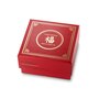 Inspired by traditional Chinese artforms, the main design celebrates the Year of the Dragon through its depiction of a Wood Dragon chasing the Dragon Pearl, or Fire Ball that represents wisdom and prosperity. The snake-like form of the auspicious creature echoes the stylized waves that rise and fall beneath it, like a landscape marked by rolling hills. Auspicious cherry blossoms appear on the dragon and in its surroundings, where the delicate flowers are connected by curved stems that create filigree patterns.