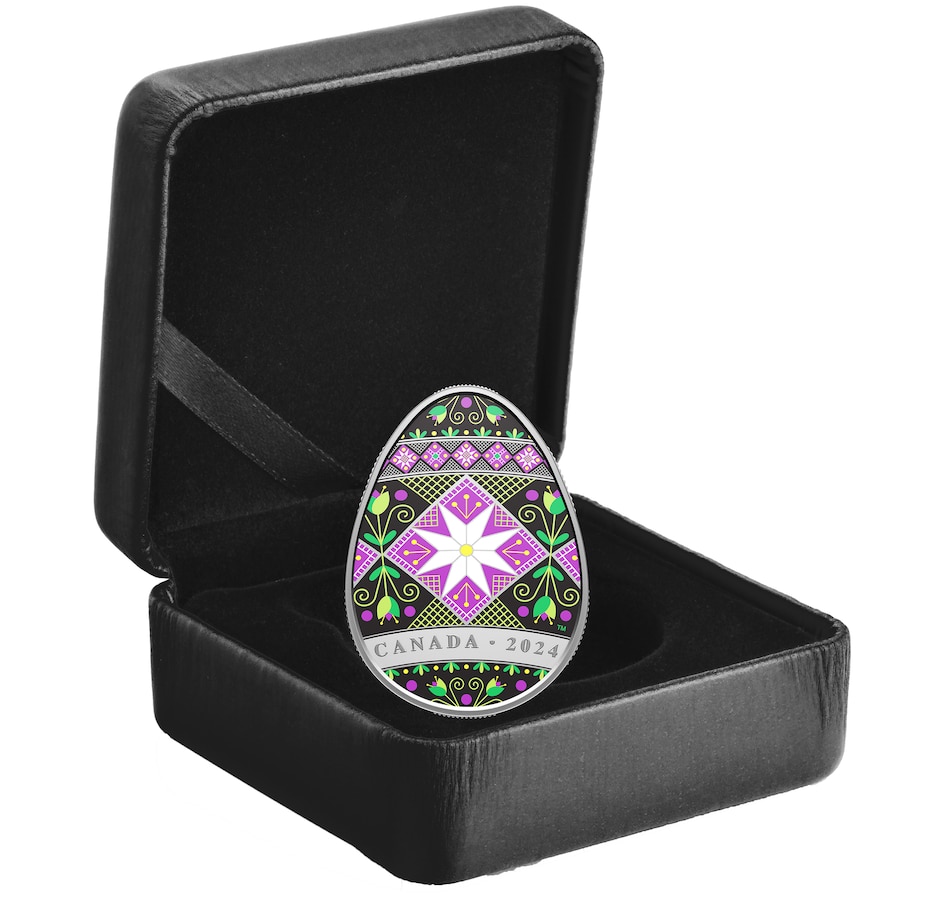 This 2024 $20 fine silver coin continues the tradition of celebrating life and the season of renewal through an intricately designed and selectively coloured Ukrainian Pysanka egg.  All previous coins in this annual series that started in 2016 have sold out from the Royal Canadian Mint immediately upon release and appreciated in value in the secondary market.  This Easter symbol of renewal will have extra meaning as the Royal Canadian Mint is donating the net proceeds to the Ukraine Humanitarian Appeal.