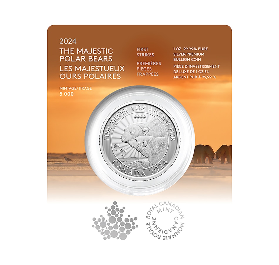 This 2024 one-ounce fine-silver five-dollar coin celebrates Canadian wildlife while providing one of the most affordable opportunities to acquire a beautiful Royal Canadian Mint limited-edition collector coin. The design, by Canadian artist W. Allan Hancock, shows a polar bear mother and her almost independent cub nuzzling in their Arctic habitat. Paired with paw print markings that reflect the theme, the tender scene is set against radial lines that create a dramatic sunburst finish, while the coin's purity and weight, the word "Canada" and the year "2024" are all inscribed along the outer edge. The obverse features a sunburst finish behind the effigy of His Majesty King Charles III by Canadian artist Steven Rosati.