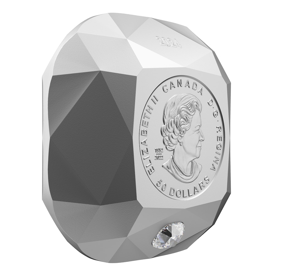 This unique 2024 $50 fine silver coin from the Royal Canadian Mint combines innovation with the beauty of a real Canadian mined cushion-cut shaped diamond. A diamond's cut creates a sparkle that makes it an everlasting symbol of love burning bright, and nowhere is this more evident than with this extraordinary coin, which is both shaped like a diamond and includes a real inset .23-carat De Beers cushion-cut shaped diamond.