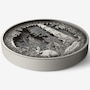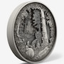 This large and visually stunning four-layer cutout coin stems from minting innovations developed by the Royal Canadian Mint's Research and Development Facility. Just as the minting technology uses multiple layers, the theme is also multi-layered showcasing a forest scene where an animal predator may also be the prey. This is a substantial piece with a weight of more than three-quarters of a kilogram (23.75 ounces) of fine silver and a diameter of 102 mm. Filled with lush flora and hidden fauna, the shadow box design is composed of superimposed layers of engraving that gently overlap, each casting shadows on the next and obscuring important story details that are only visible when viewed from a certain angle, ultimately revealing that the hunter may actually be the hunted.