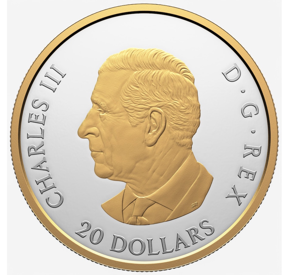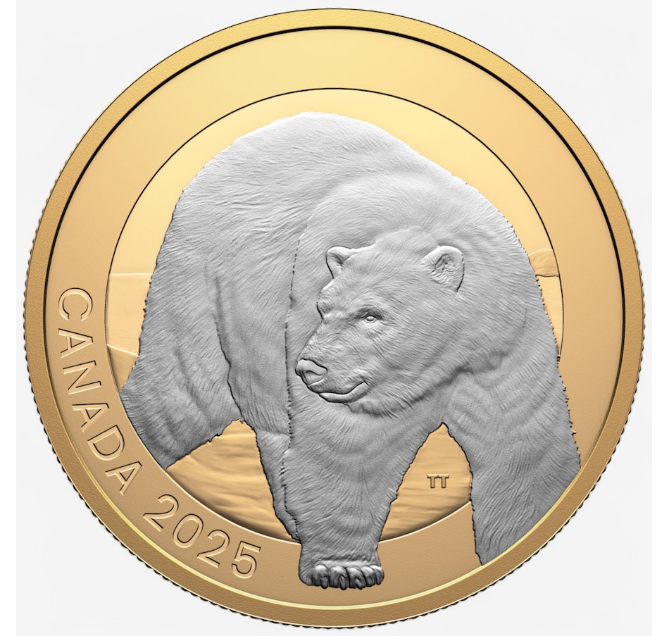 The design features an engraved portrait of the polar bear surrounded by yellow gold plating. Moving across the snow-covered ice that lies at the sea's edge, the polar bear looks off to the side as it steps out of the central portion of the design, placing its forepaws onto the outer portion where "Canada" and "2025" are engraved. The obverse features the gold-plated effigy of His Majesty King Charles III by Canadian artist Steven Rosati.