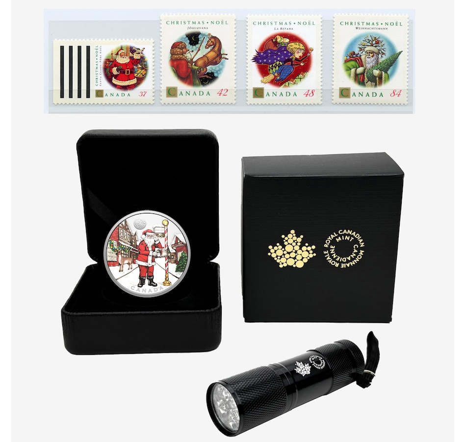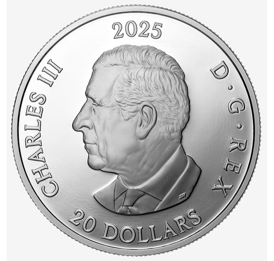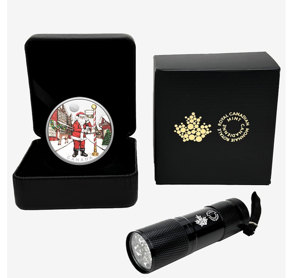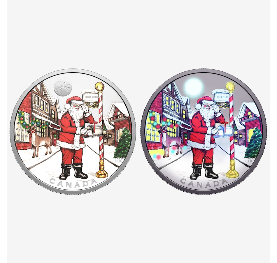 Capture the magic and thrill of the holiday season with this 2025 $20 one-ounce fine silver coin. The design features a view of Santa's home and workshop at the North Pole, where a full moon appears in the night sky. Joined by one of his magical reindeer, Santa Claus adjusts his glasses as he reaches for the latest letters that have landed in his mailbox, which is affixed to a candy cane post with a hanging sign that reads "H0H 0H0," the Canadian postal code for the North Pole. When viewed under the included black light, the festive holiday lights and décor, the nearby street light, the moon and the top and base of the pole all glow in the dark, while the glowing "Dear Santa" letters represent holiday magic. The obverse features the effigy of His Majesty King Charles III by Canadian artist Steven Rosati.