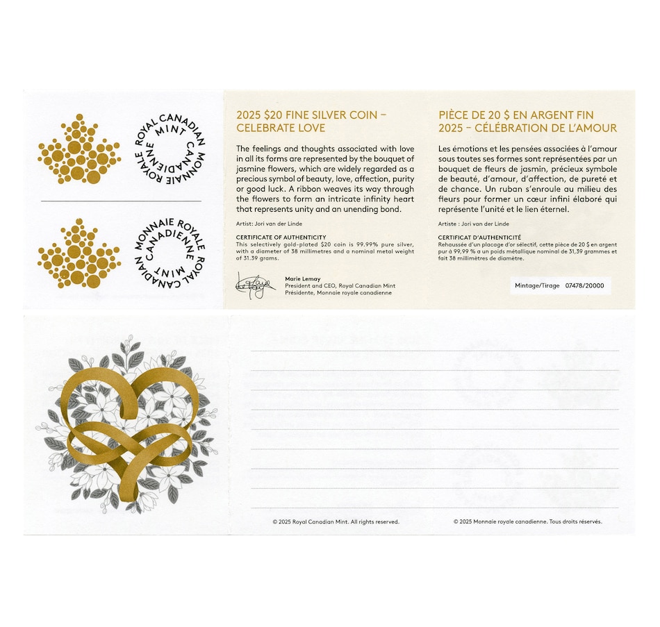 This 2025 $20 fine silver coin featuring a selective gold-plated and intricately patterned heart will make an ever-lasting gift for someone you care about. Designed to mark Valentine's Day, a wedding, engagement, anniversary, Mother's Day, birthday or "just because," this coin makes for an elegant and enduring memento. The design features a ribbon-style infinity heart atop of a bouquet of jasmine flowers, which are widely regarded as a precious symbol of beauty, love, affection, purity or even good luck. That sentiment is amplified by yellow gold plating, which invites you to let love shine bright by showing you care. The obverse features the effigy of His Majesty King Charles III by Canadian artist Steven Rosati.