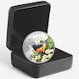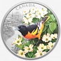 This selectively coloured 2025 $20 fine silver coin presents an up-close showcase of a Baltimore oriole, one of the most striking birds that brightens Canada's great outdoors. If the Baltimore oriole's happy whistling song doesn't catch your attention in nature, its fiery orange plumage certainly will. A spring and summer resident of southern Canada, this energetic bird loves to perch high among the treetops in open woodland or along waterways, as illustrated on this selectively coloured coin, where the male's bold colours contrast beautifully with the more delicate hues of a flowering dogwood.