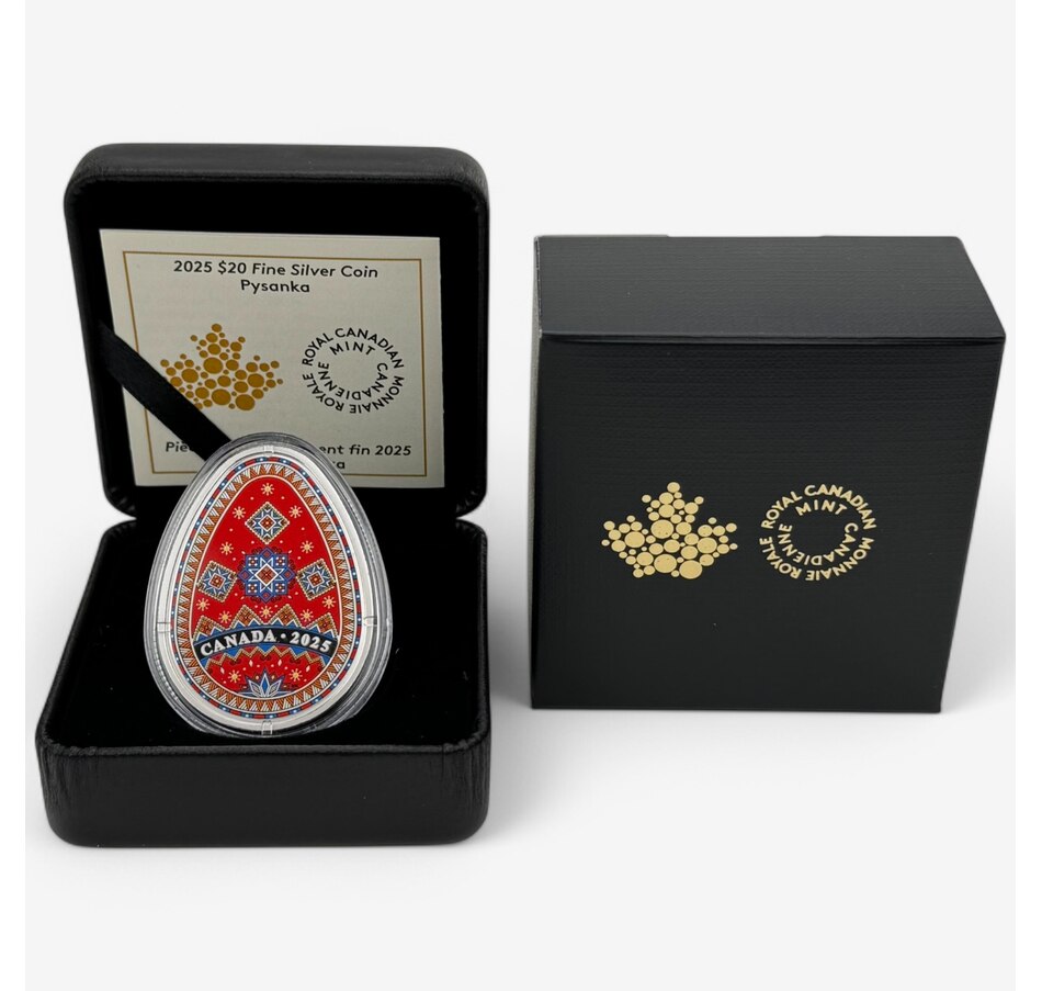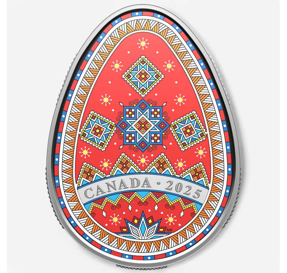 This 2025 $20 fine silver coin continues the tradition of celebrating life and the season of renewal through an intricately designed and selectively coloured Ukrainian pysanka egg.  All previous coins in this annual series that started in 2016 have sold out from the Royal Canadian Mint immediately upon release and have appreciated in value in the secondary market.