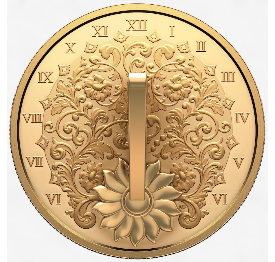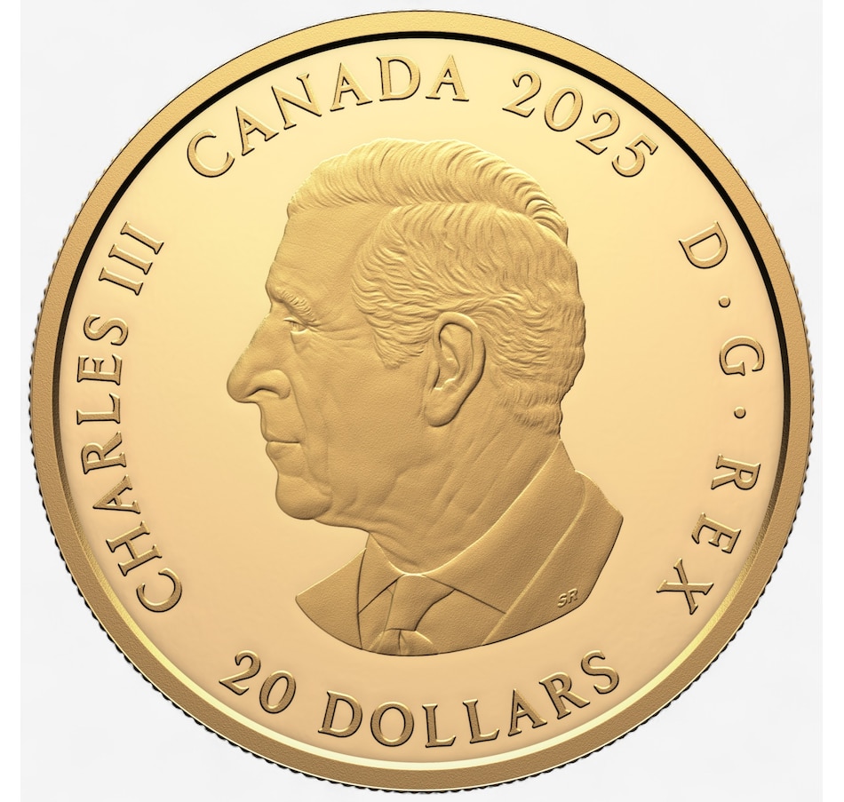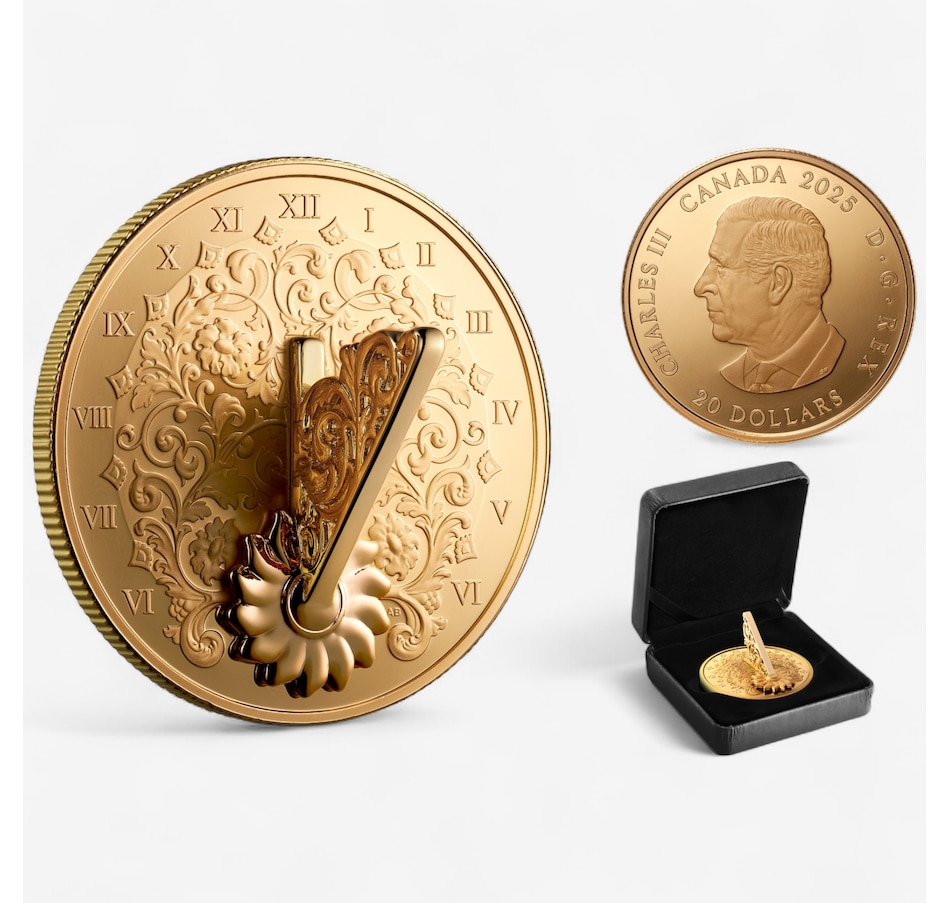 Serving as the base, the background design for the sundial is ornamented with acanthus leaves and edged with Roman numerals indicating the hours from 6:00 a.m. to 6:00 p.m. At the bottom, a stylized sunflower—a heliotropic flower and a beloved symbol of the sun—supports the gnomon, which harnesses the power of sunlight and casts the measured shadow that helps determine the time of day. The obverse features the effigy of His Majesty King Charles III by Canadian artist Steven Rosati.