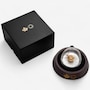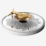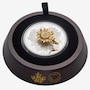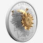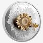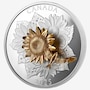 This large format coin captures the light and colours of a summer day in an open field, where sunflower blooms tower above leaves dotted with raindrops. The 3D flower at the centre has attracted the attention of a seed-eating American goldfinch, which are both formed in yellow gold-plated sterling silver set atop a five ounce fine silver base. The coin shows off its magic when it is tipped or moved, causing the goldfinch to circle the bloom.