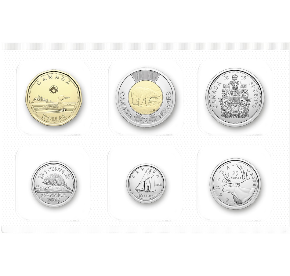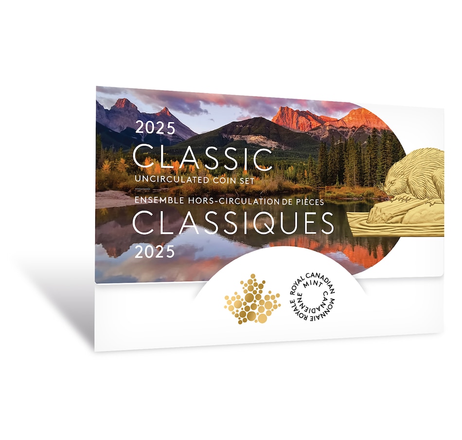 The 2025 Classic Canadian Uncirculated Coin Set is a powerful reflection of its history and natural legacy, all represented by some of the most well-known Canadian emblems of all time. The set includes some of the first-struck numismatic uncirculated examples of all six Canadian coin denominations including the scarce half-dollar, which is no longer issued for circulation. The designs showcase some of Canada's most famous iconography, and come sealed in a protective packaging that continues a long tradition started in 1962. The obverse of each coin features the effigy of King Charles III by Steven Rosati.