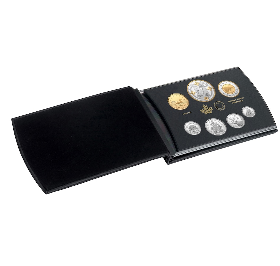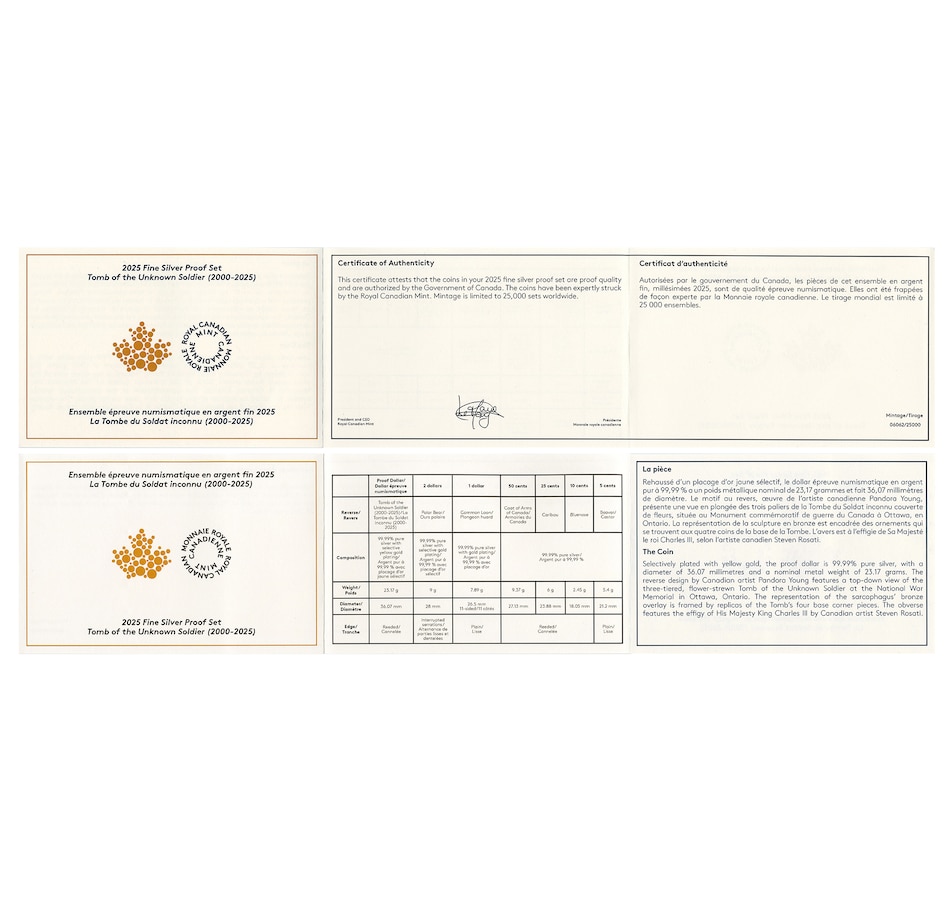 This seven-piece proof set contains a selectively gold-plated version of the 2025 fine silver proof dollar, which marks the 25th anniversary of the completion of the Tomb of the Unknown Soldier at the National War Memorial in Ottawa, Ontario. A set exclusive, the coin's reverse is enhanced with yellow gold that highlights the tomb's four corner pieces, as well as the outer edge that frames this circular interpretation of one of Canada's most hallowed monuments.