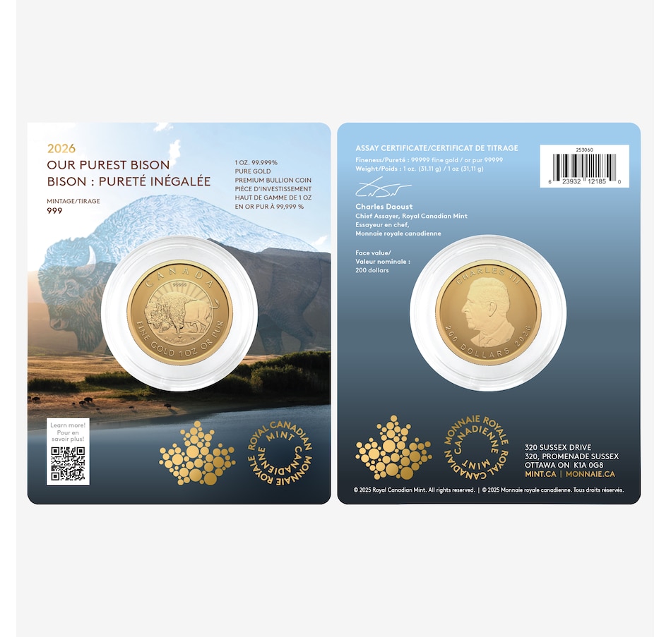 While the Royal Canadian Mint has described this 2026 one-ounce gold bison coin as "premium bullion," the unique design and very low mintage of just 999 coins will make this both a scarce collectible and an investment in pure gold. Crafted in the highest purity standard of .99999 fine ("five nines" or 99.999% pure) with a minimum guaranteed weight of one troy ounce, this is one of the world's purest gold coins in a convenient standard investment size.