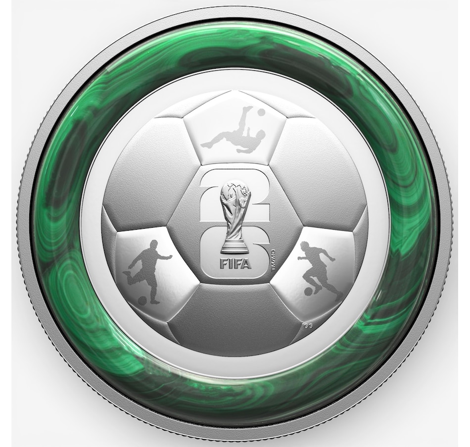 The sport, the spirit of FIFA World Cup 2026, the players' skill, and the iconic trophy—all are celebrated on this five-ounce coin, where a soccer ball engraved in ultra-high relief becomes a canvas for the tournament's story. Struck incuse at the centre, the official emblem marks the global stage, while three action-filled player panels capture the passion and plays that make every match unforgettable. Encircled by a genuine malachite ring inspired by the FIFA World Cup Trophy's base, the design links the energy of the game to its ultimate prize, making it a stunning symbol of the tournament's spirit and prestige. Malachite is a semi-precious stone featuring beautiful designs in which the bands of lighter and darker green come together to produce swirls and patterns of unequalled beauty in the gemstone world.