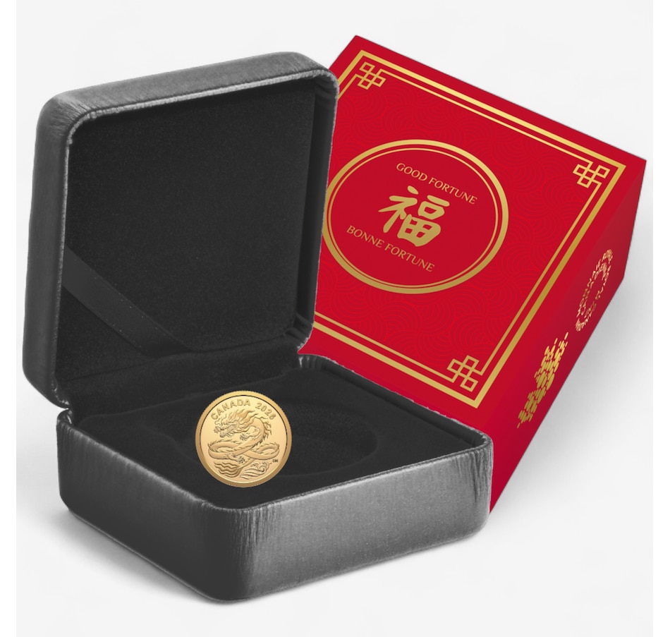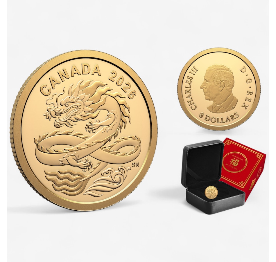 Mark 2026 with this affordable $8 fine gold coin featuring a lucky dragon. The design by Canadian artist Simon Ng features a stylized depiction of a dragon, the benevolent creature of Chinese mythology. Paired with waves that usher in prosperity and joy, the dragon forms the shape of the lucky number eight. While small in size with a 14.1-mm diameter and a weight of 1/20th of an ounce, the coin features exceptional detail and a premium finish. The obverse features the effigy of His Majesty King Charles III by Canadian artist Steven Rosati.