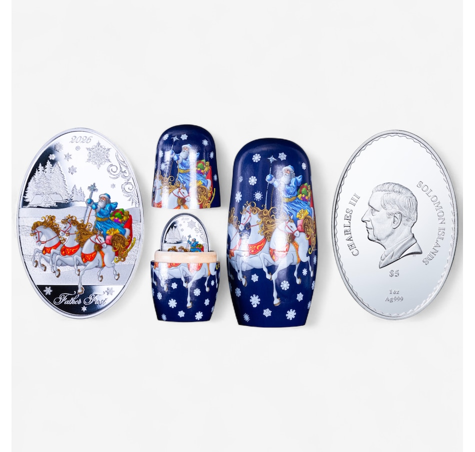 Capture the spirit of Christmas with this beautiful 2026 one ounce $5 pure silver coin dedicated to Father Frost, the Slavic version of Santa Claus. Opening the presentation is a big part of the experience, as the coin comes in a two-part set of painted wooden Matryoshka nesting dolls. The coin features an oval shape with selective colour application and a mix of various frostings to create a cool winter scene. Father Frost takes center stage riding his sleigh pulled by three noble horse, a symbolic tribute to strength and grace. The obverse includes the effigy of His Majesty King Charles III and the inscriptions: "Charles III," "Solomon Islands," "$5," "1 Oz Ag 999."