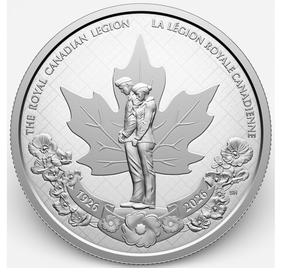 The design by Canadian artist Steve Hepburn presents two Legion members standing in remembrance, set against the maple leaf from the Legion's official crest. In the background, the fabric pattern symbolizes the Legion's role as a national community service organization, woven into the social fabric of Canada. Arching the bottom, the floral arrangement consists of 14 poppies, one for each Canadian province and territory, and another for the Legion's international branches. On the right side of the floral arrangement is a forget-me-not flower, a symbol of remembrance in Newfoundland and Labrador. Beneath this, three poppies from the Legion's official crest adorn the scroll banner marked with the anniversary dates "1926" and "2026." The obverse features the effigy of His Majesty King Charles III by Canadian artist Steven Rosati.