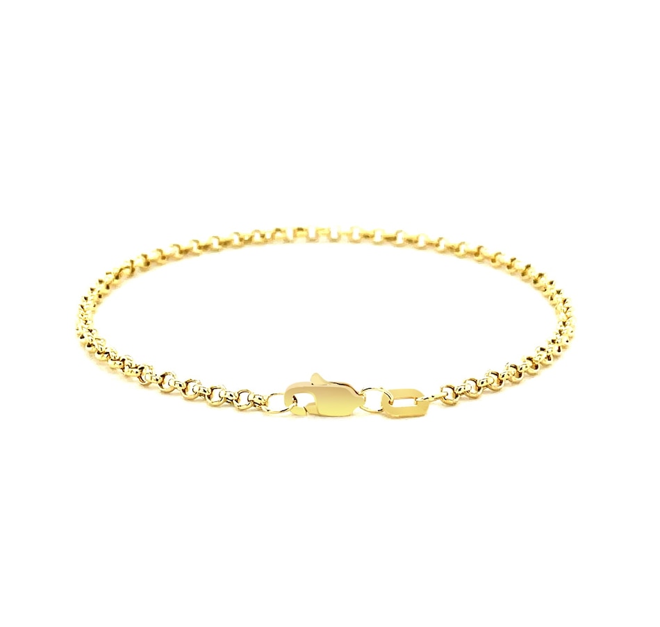 This rolo bracelet comes in 14k yellow gold and has a width of 2.3 millimeters. Secured with a lobster clasp.