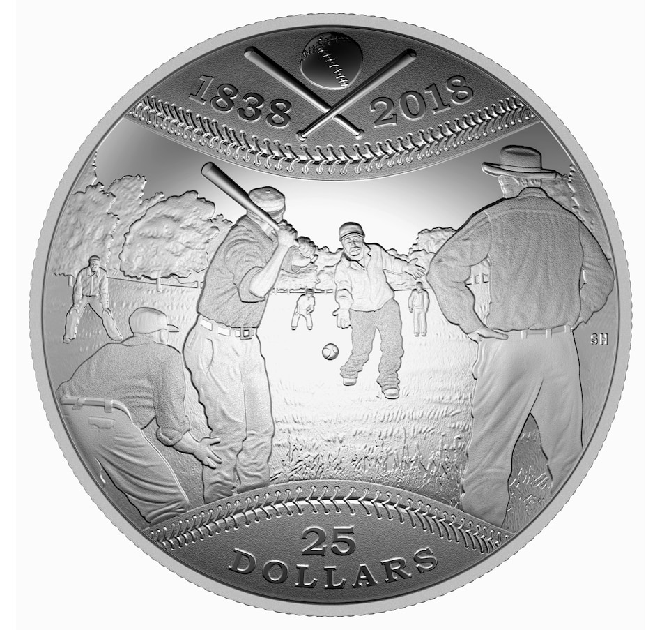 The reverse design by artist Steve Hepburn deftly combines art and technology to re-create a historic sports moment. Paired with engraved stitchwork, the coin's curvature transforms the reverse into a baseball-shaped canvas fit for commemorating the earliest documented game played in Canada. The highly detailed image provides a prime view of the action during the match, which took place on June 4, 1838, in Beachville, Ontario. As seen from behind the "knocker's stone" (now known as home plate), the participants from Beachville and Zorra are all in position: one team stands in the open field, ready to catch the ball; a "knocker" (batter) from the opposing team grips the "club" (bat) as he keeps his focus on the ball tossed by the "thrower" (pitcher); to the right of him, an umpire leans in to rule whether the ball is "fair" or "unfair." At their feet, the denomination "25 dollars" is engraved in a vintage-style font, while in the arched banner above the double commemorative dates "1838" and "2018" flank a rendering of the equipment used in that era: two clubs (crossed) and a yarn ball covered by stitched calfskin.