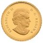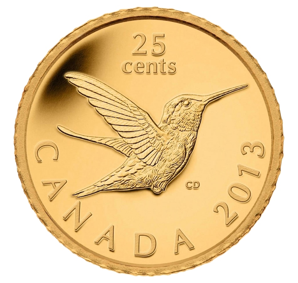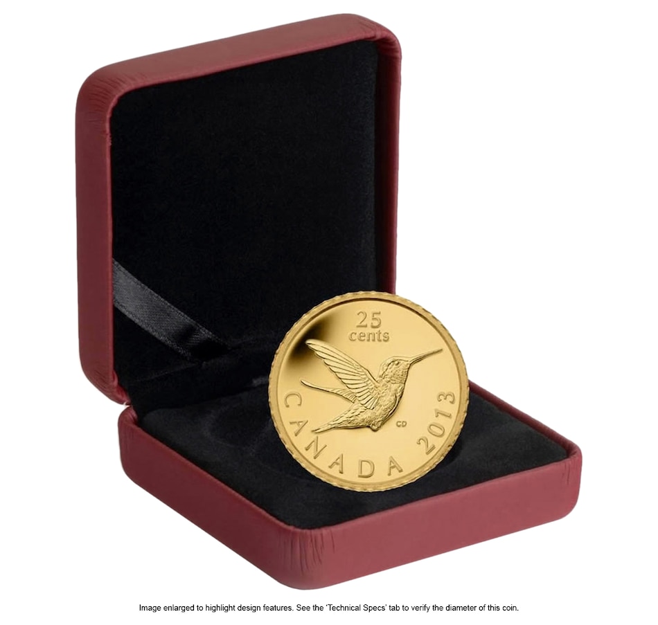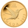 This very small pure gold coin features a ruby-throated hummingbird in flight. It is double struck with a frosted cameo proof finish, and engraved with the nominal face value of "25 Cents" at the top of the coin and "Canada 2013" along the bottom rim. This is the first coin in a new small animals series on Royal Canadian Mint's smallest gold coins.