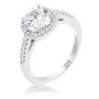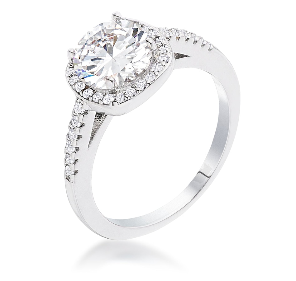This engagement styled ring adds a touch of youth while maintaining its traditional elegance. A beautiful 9mm cushion cut Cubic Zirconia stone sits within a delicate single halo embedded with dainty 1mm stones. Its plated pave band sits fine on the finger to keep its high front and center.