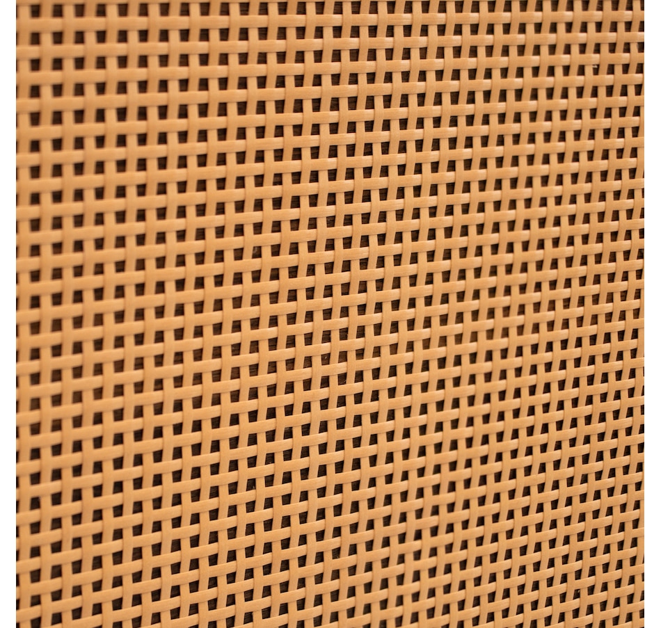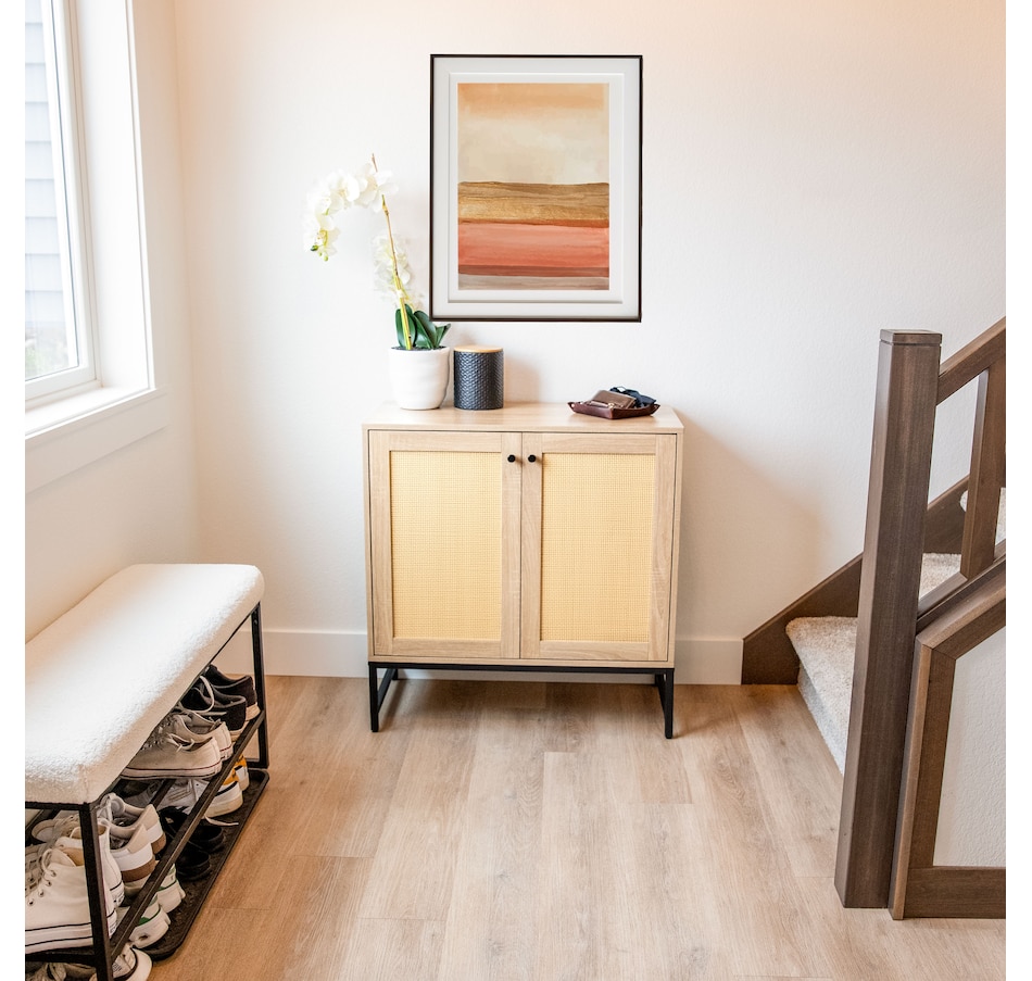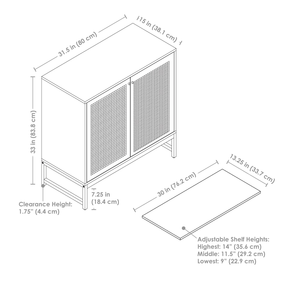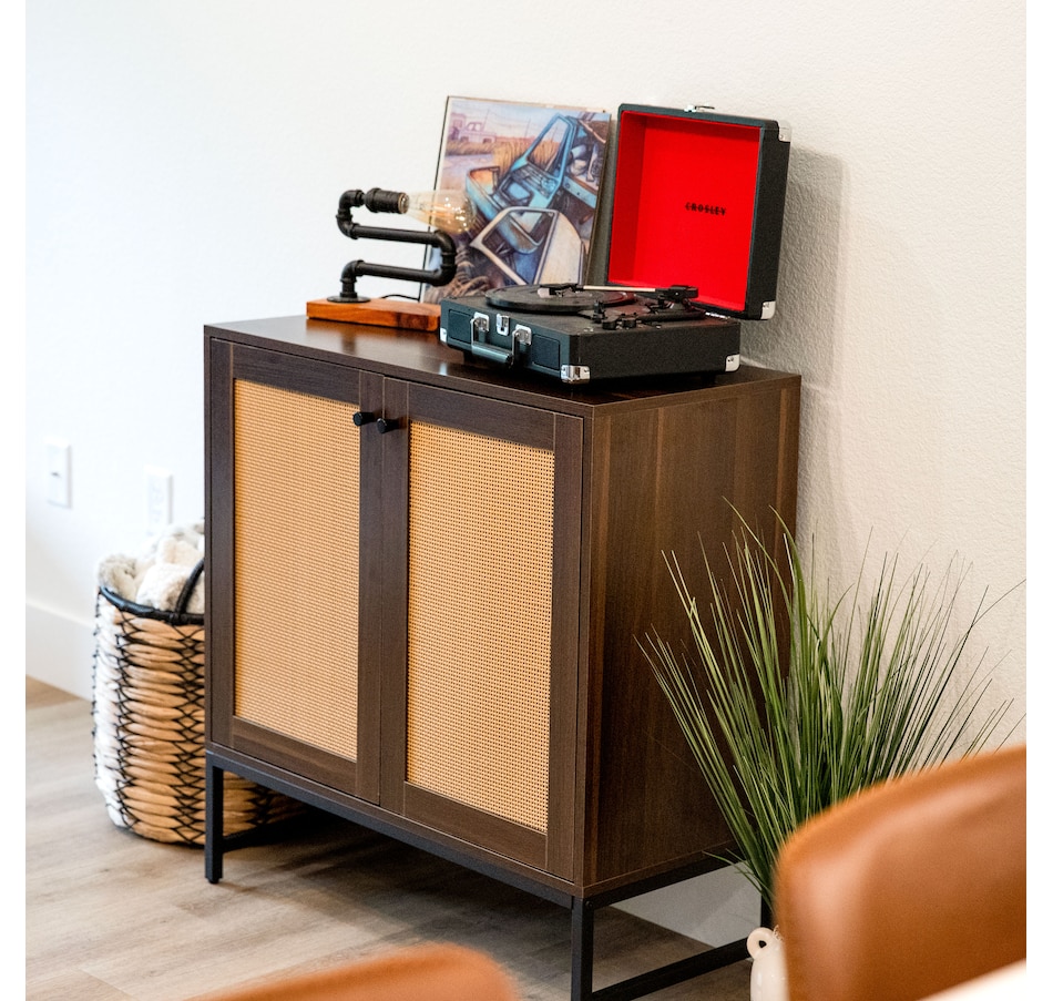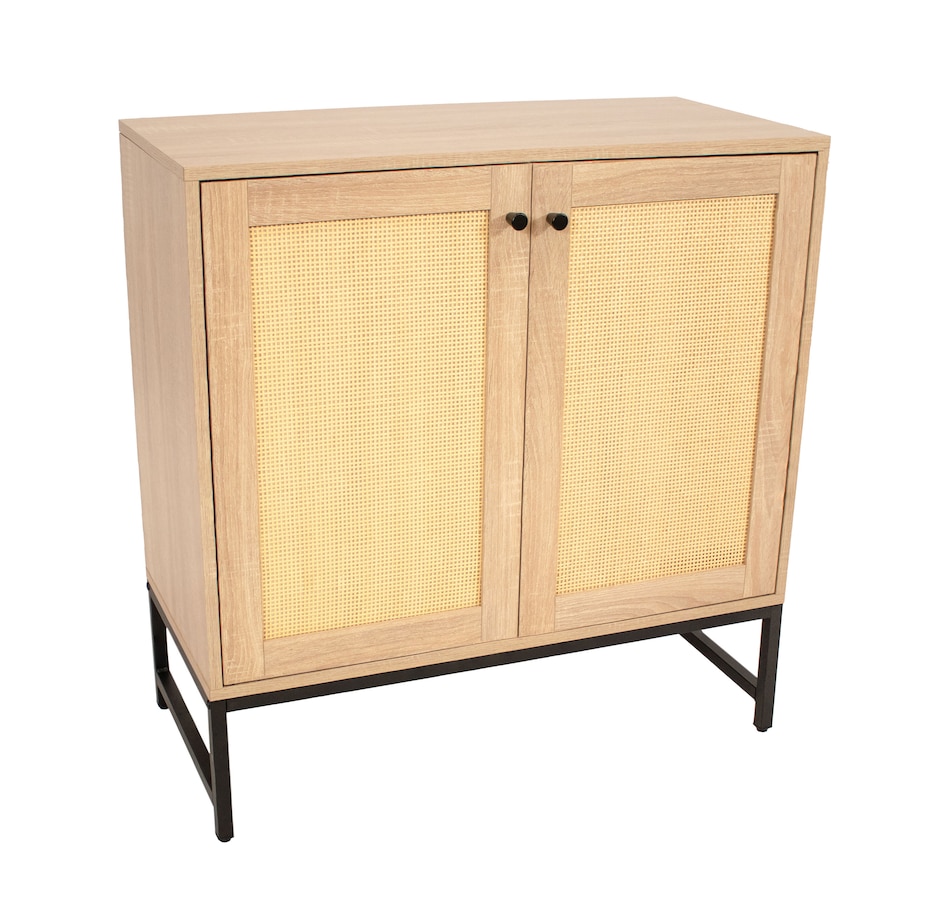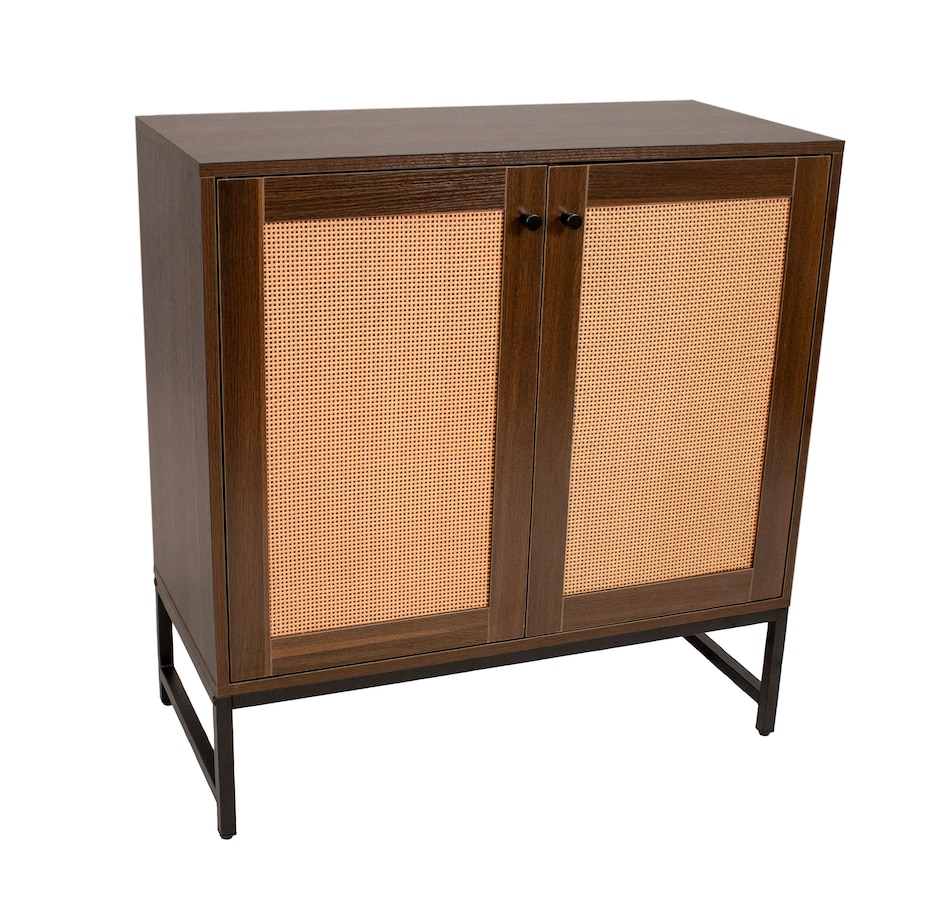 Get sophisticated style and ample storage for the living or dining room with this beautiful rattan cabinet with doors. This sturdy 2-door accent cabinet is made from MDF board for an authentic wood look and a durable black steel frame. Choose between either a dark wood or a light wood look. It features two doors with a unique rattan design for texture and visual interest. The sturdy interior shelf is capable of supporting up to 30 lbs and the overall unit has a weight capacity of 160 lbs. This credenza is an elegant addition to the living room, dining room, or home office and provides a convenient surface to display knickknacks and pictures as well as ample interior storage for board games, books, craft supplies, and much more. Plus, this cabinet includes a convenient anti-tip kit to help keep the unit securely upright and help prevent it from accidentally being knocked over.