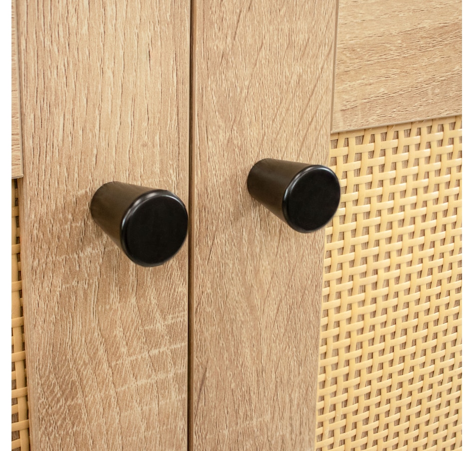 - Textured rattan doors add visual interest