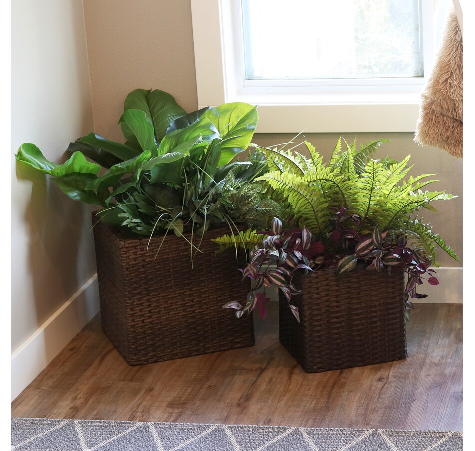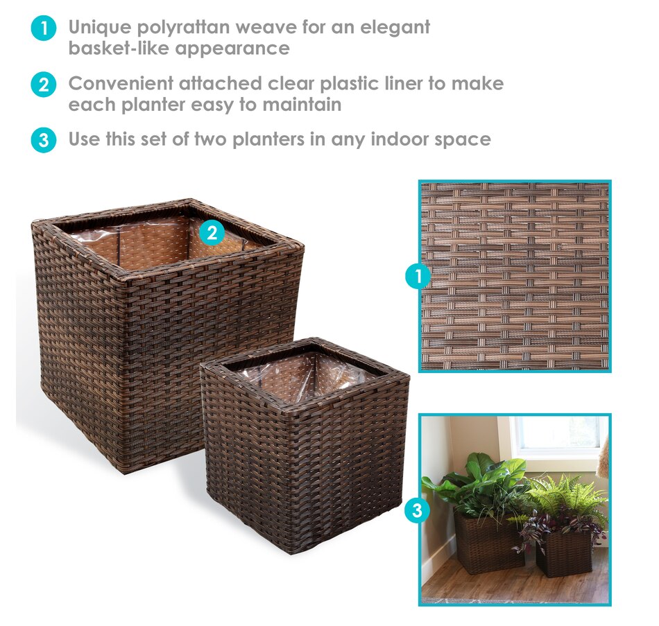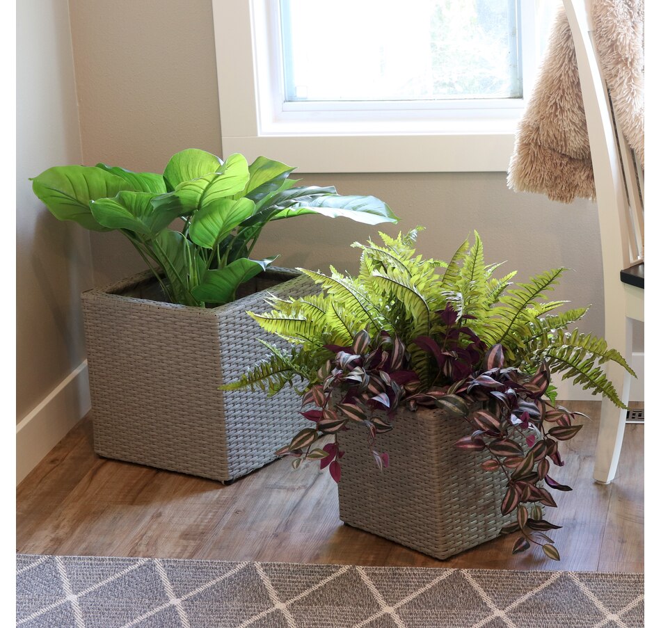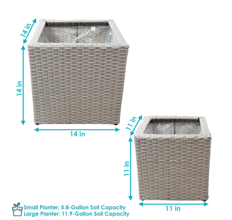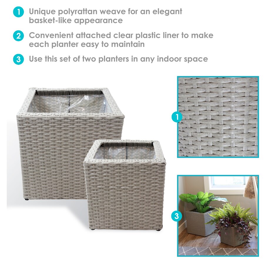 Add texture and charm to indoor spaces with this set of two square planters. Crafted from durable polypropylene, each planter features a woven polyrattan design that mimics the look of natural rattan while offering enhanced durability. Unlike traditional rattan, polyrattan resists chipping and maintains a smooth finish over time. Designed for indoor use, these planters include attached clear poly liners that help contain soil and moisture, making plant care and cleanup more convenient. The set includes one large and one small planter to suit a variety of plant sizes. The large planter measures 14" tall and 14" wide with a soil capacity of 11.9 gallons, while the smaller planter stands 11" tall and 11" wide and holds up to 5.8 gallons of soil. Available in multiple colors, this planter set blends seamlessly with a range of interior styles, from modern to rustic. Whether filled with live greenery or decorative arrangements, these planters serve as functional and stylish additions to living rooms, sunrooms, bedrooms, or other indoor areas.
