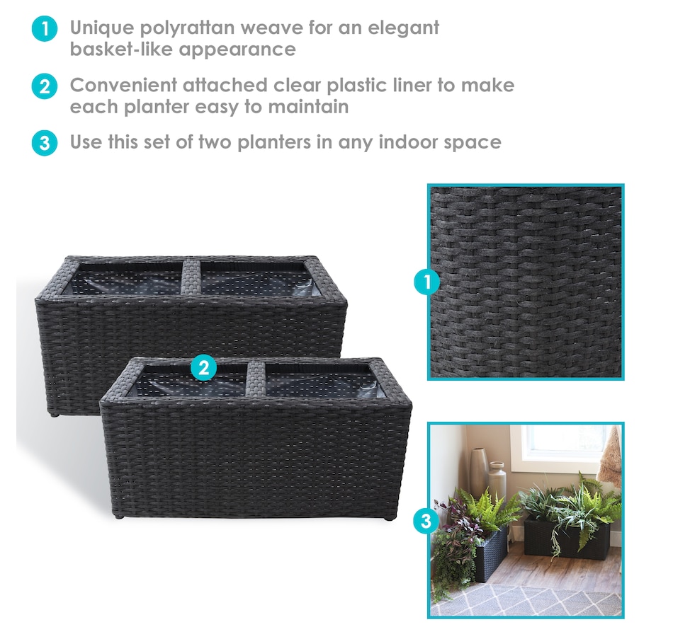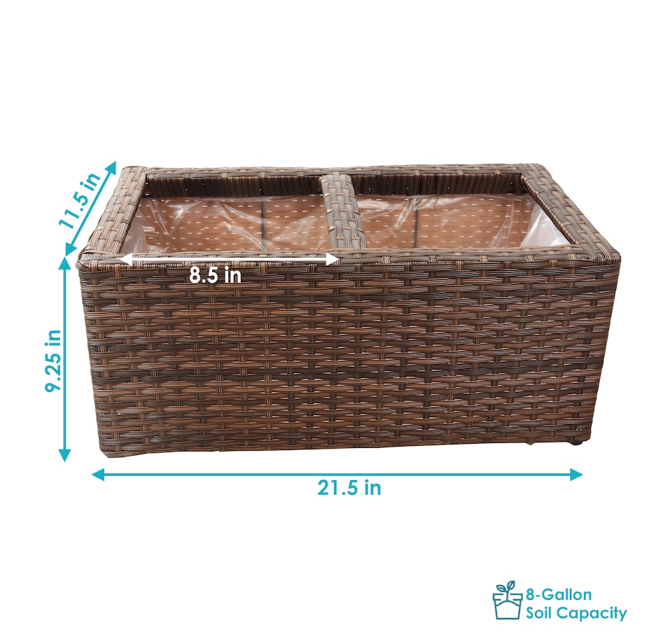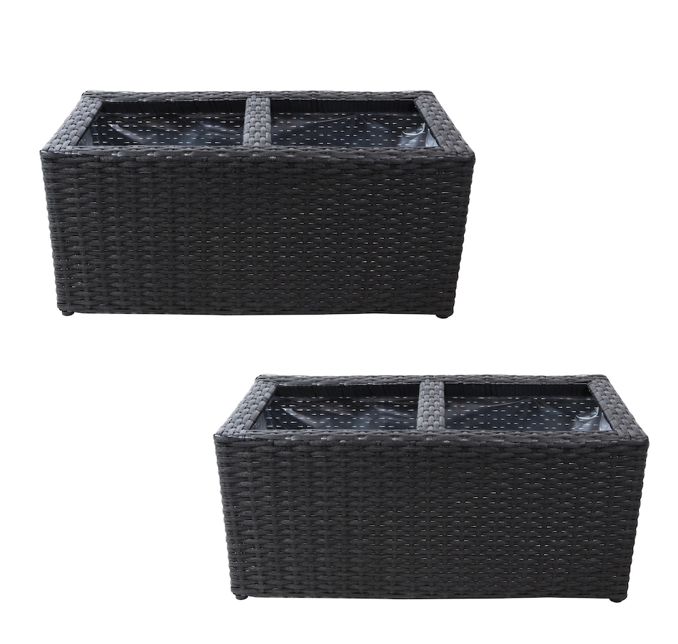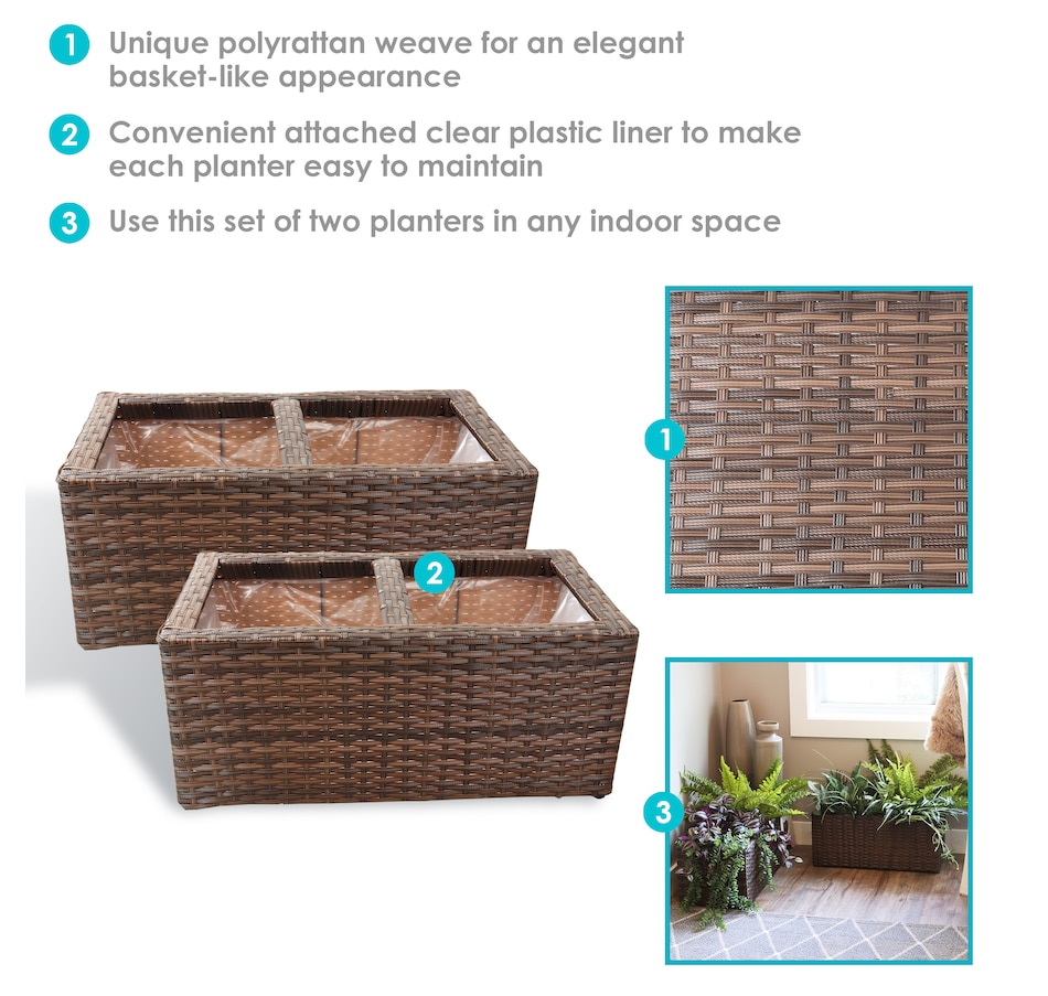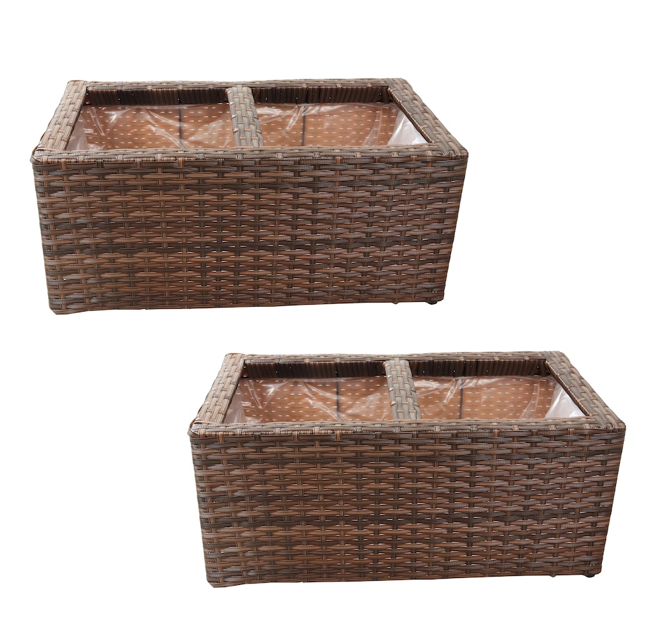 Add a touch of sophistication to indoor plant displays with this set of two flower planters. Crafted from durable polypropylene, each planter features a polyrattan basket design that mimics the look of natural rattan while offering superior weather resistance and durability. Unlike traditional rattan, polyrattan won’t splinter or chip and maintains a smooth finish over time. Each planter box includes two separate sections, allowing for a mix of plants or flowers in one container. The divided design is especially useful for organizing herbs or keeping different plant types neatly arranged. Measuring 21.5" wide and 9.25" tall, each container holds up to 8 gallons of soil—providing generous space for roots to thrive. Each section measures 8.5" by 11.5". Available in multiple colors, this planter set complements a wide range of interior styles and settings. Use them to enhance the look of a sunroom, kitchen windowsill, living area, or entryway with vibrant greenery. Stylish and practical, these planters combine decorative charm with functional design.