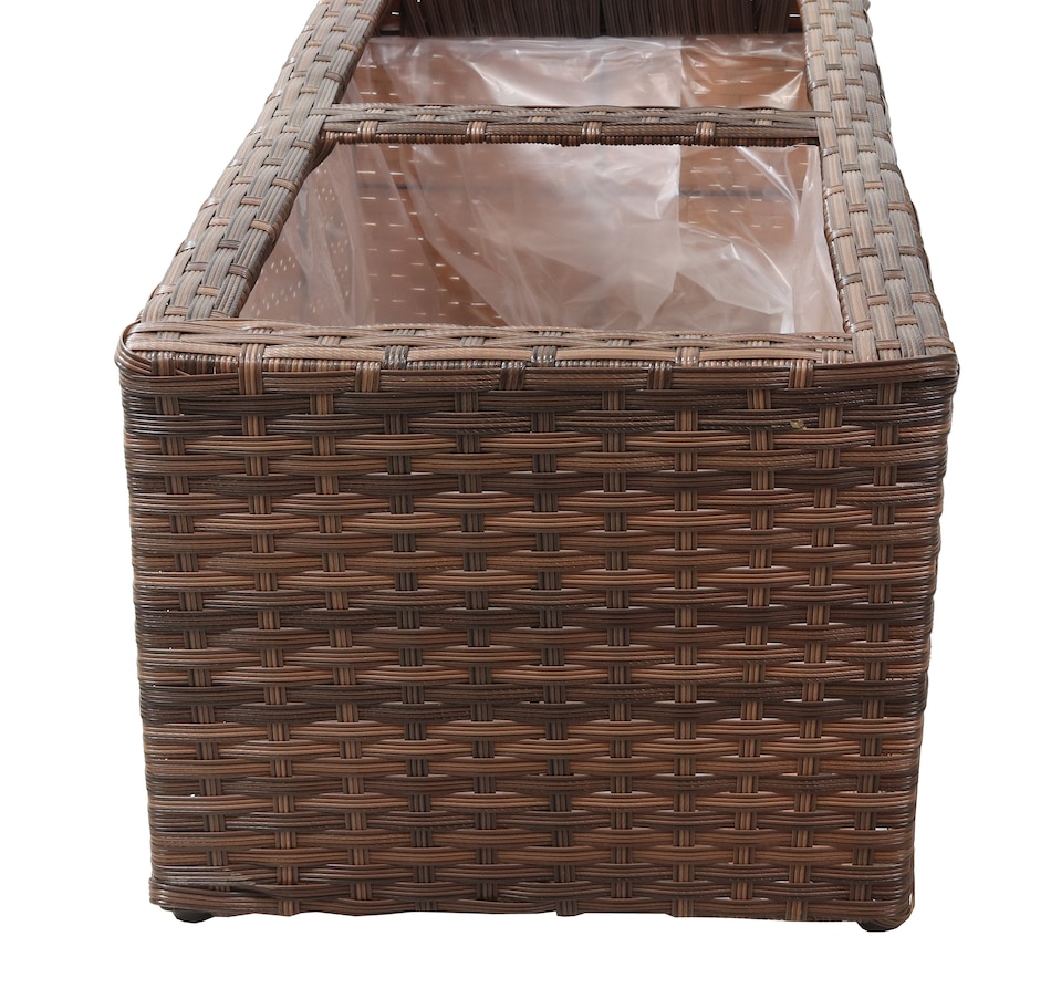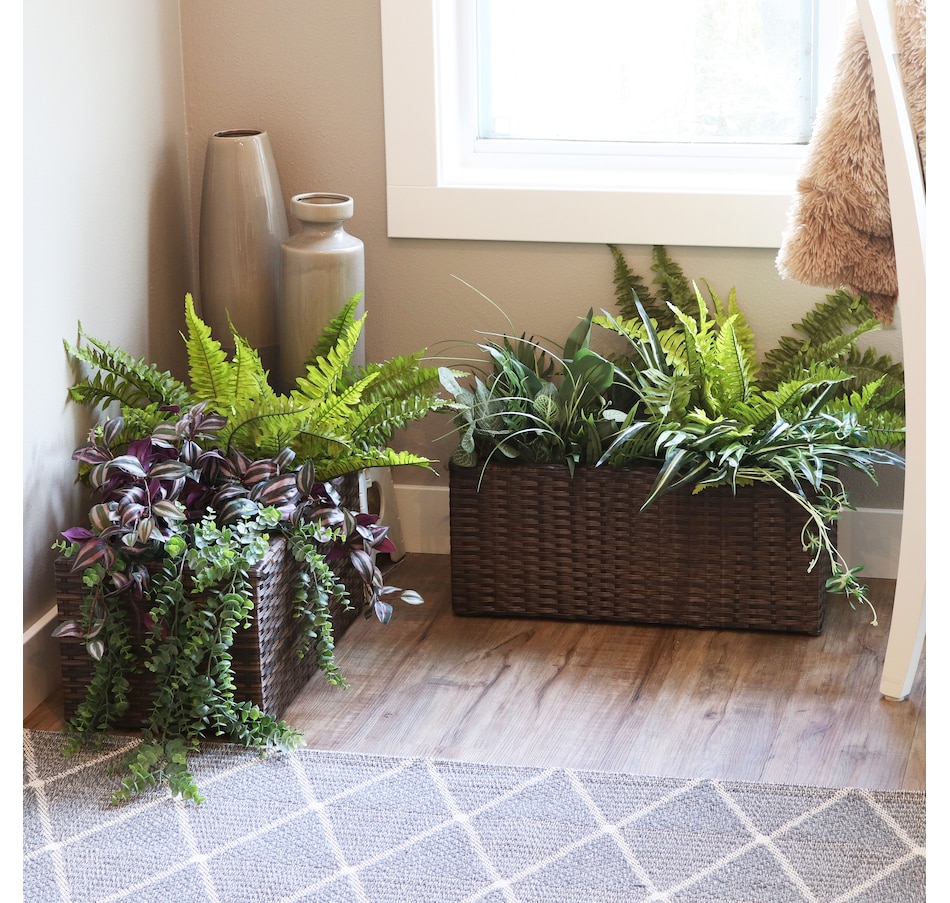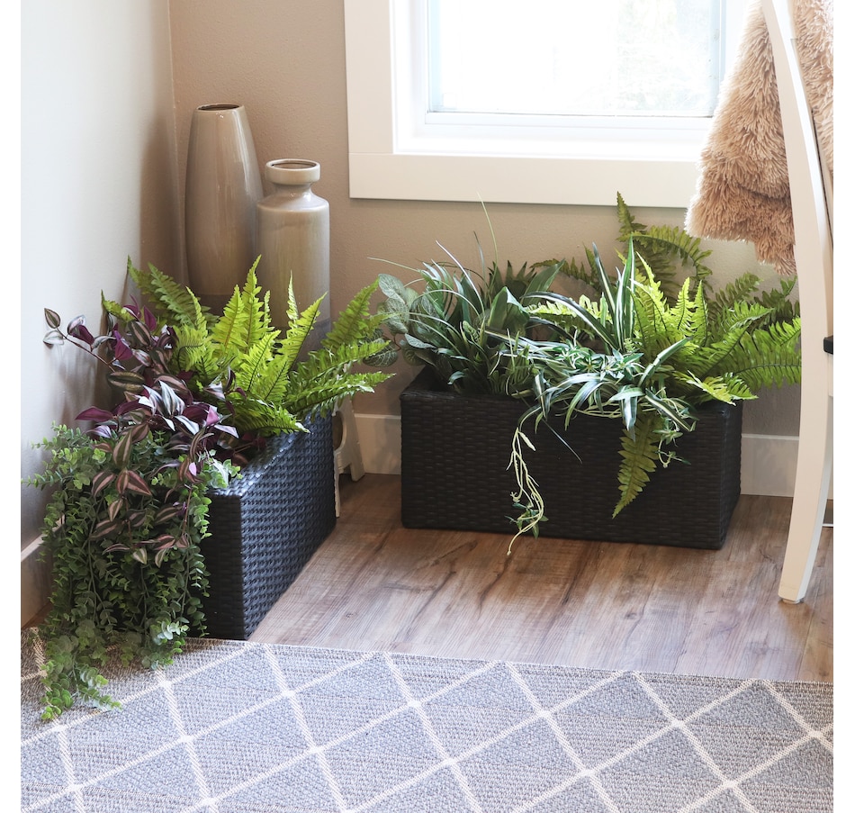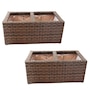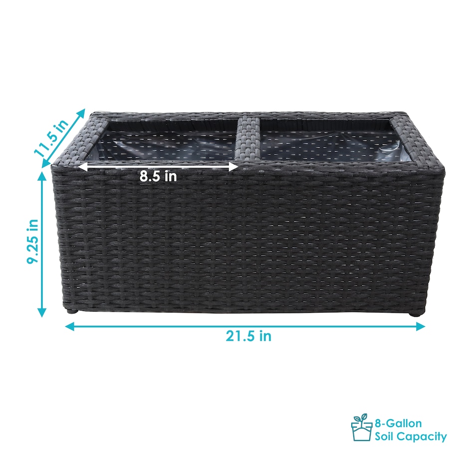 Add a touch of sophistication to indoor plant displays with this set of two flower planters. Crafted from durable polypropylene, each planter features a polyrattan basket design that mimics the look of natural rattan while offering superior weather resistance and durability. Unlike traditional rattan, polyrattan won’t splinter or chip and maintains a smooth finish over time. Each planter box includes two separate sections, allowing for a mix of plants or flowers in one container. The divided design is especially useful for organizing herbs or keeping different plant types neatly arranged. Measuring 21.5" wide and 9.25" tall, each container holds up to 8 gallons of soil—providing generous space for roots to thrive. Each section measures 8.5" by 11.5". Available in multiple colors, this planter set complements a wide range of interior styles and settings. Use them to enhance the look of a sunroom, kitchen windowsill, living area, or entryway with vibrant greenery. Stylish and practical, these planters combine decorative charm with functional design.