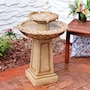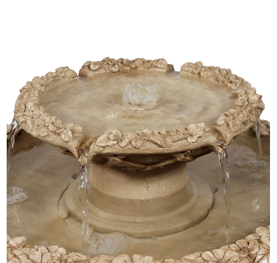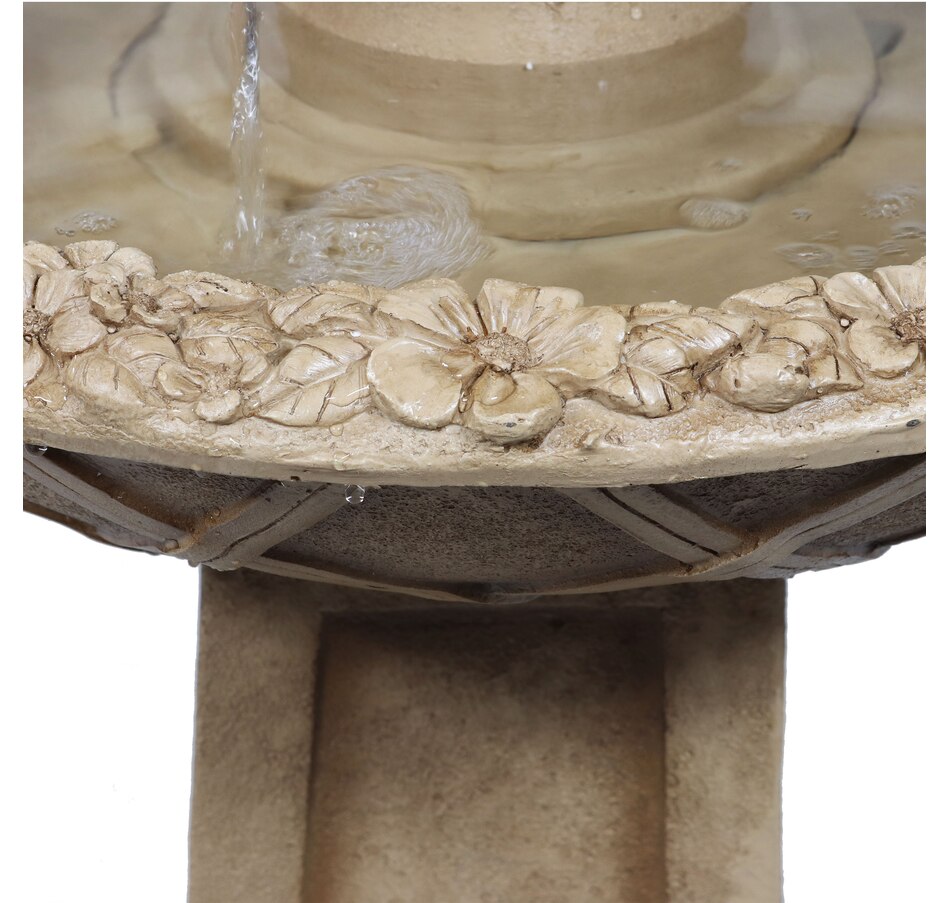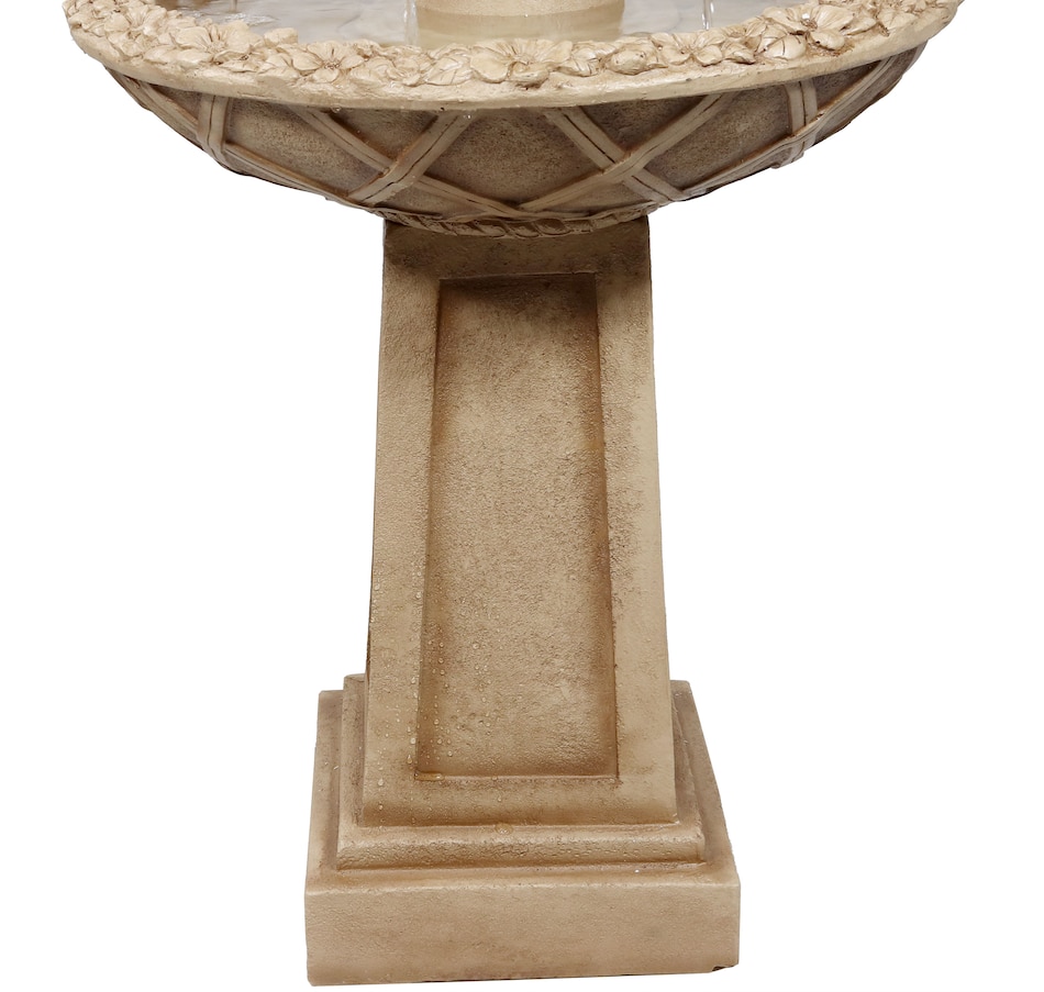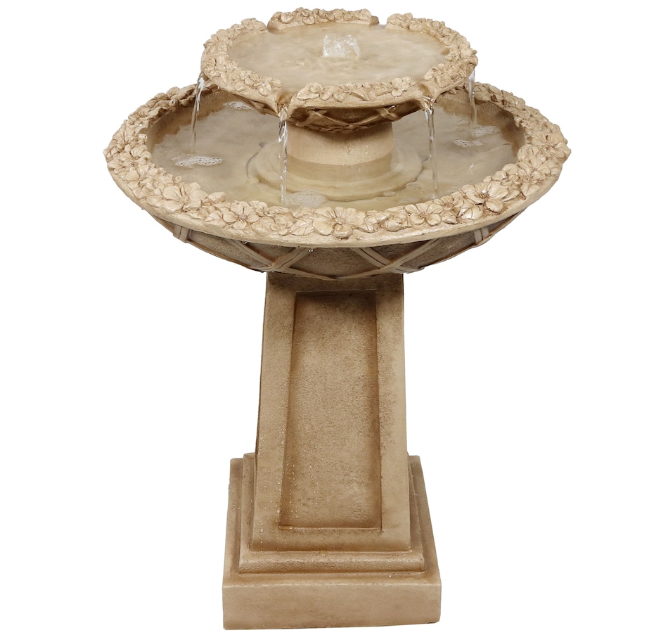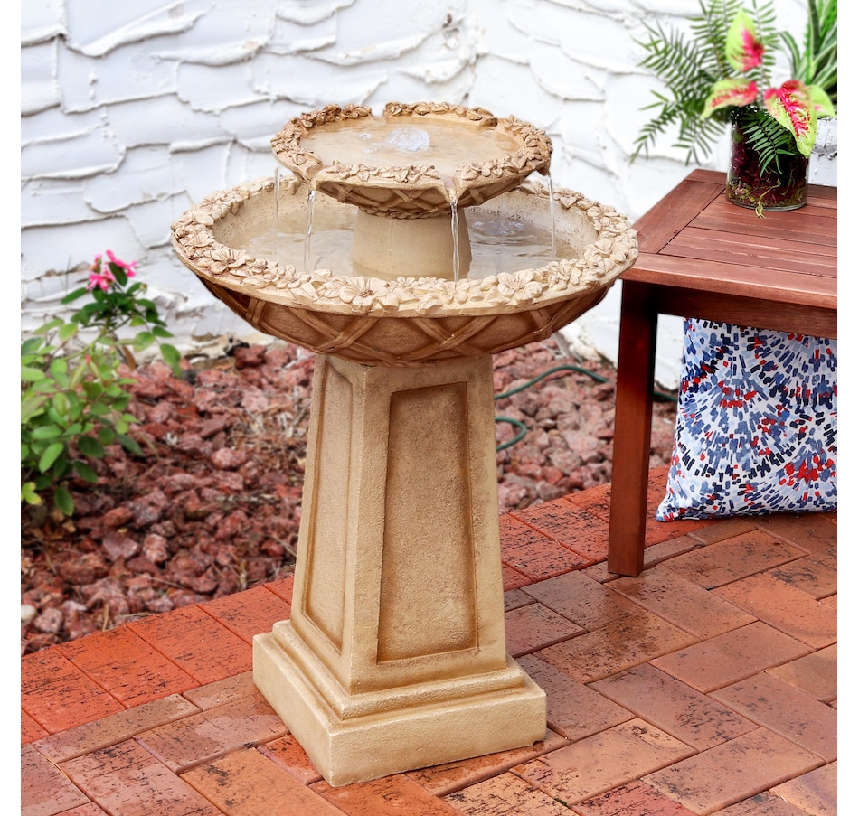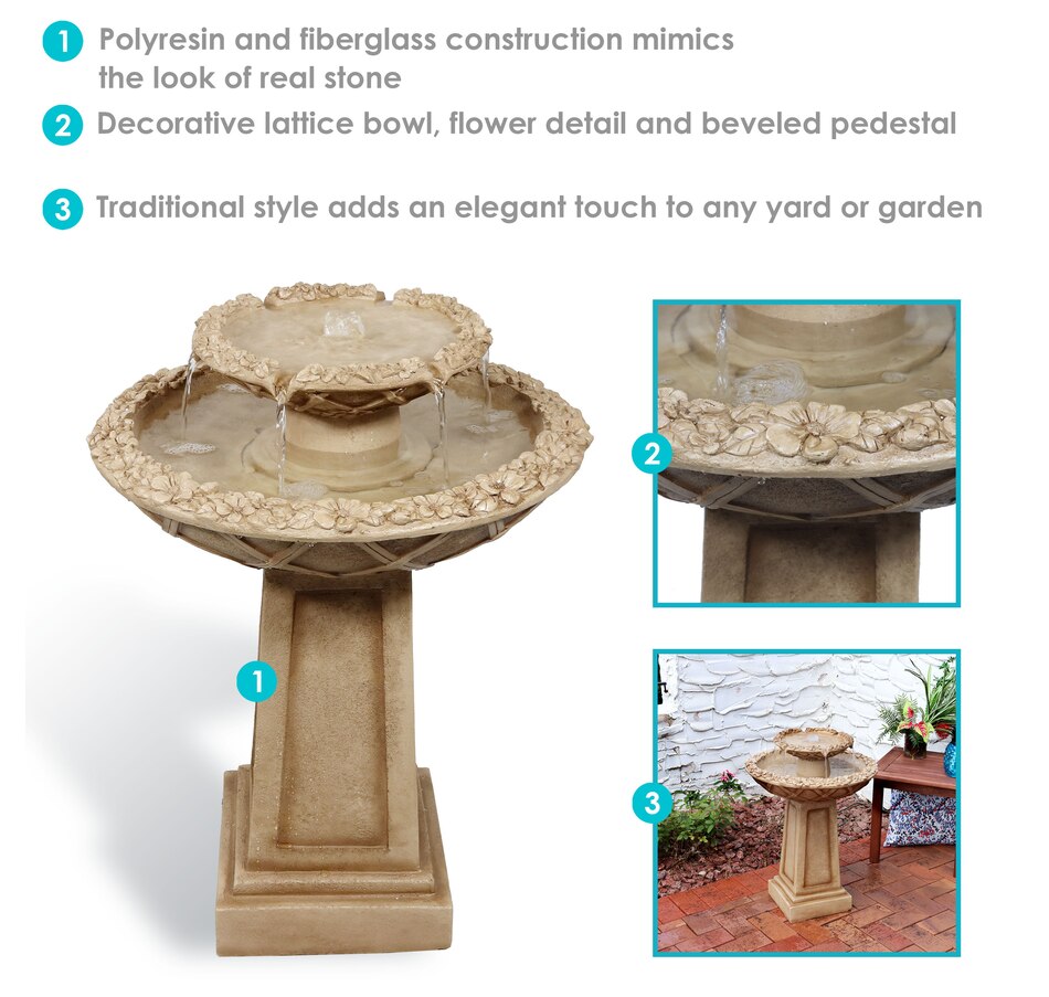 Birds will flock to this uniquely elegant outdoor freestanding fountain when placed on the patio or when made as an integral part of the landscaping. Each bird bath features a decorative lattice design on the side of each of the bowls as well as a classically beautiful, beveled pedestal. This fountain is easy to use. Once assembled and filled, simply plug it into a standard electrical outlet when it is ready to be used. The sound of the water bubbling out of the top level and streaming into the larger bottom level where it circulates through will instantly soothe guests and loved ones after a long day. Plus, pests are not particularly fond of moving water, so that will further entice birds to use this 2-tiered fountain. The lightweight polyresin and fiberglass construction is also easy to clean and maintain, helping to keep the fountain looking fresh for longer as it is durable against the elements outdoors.