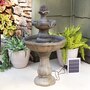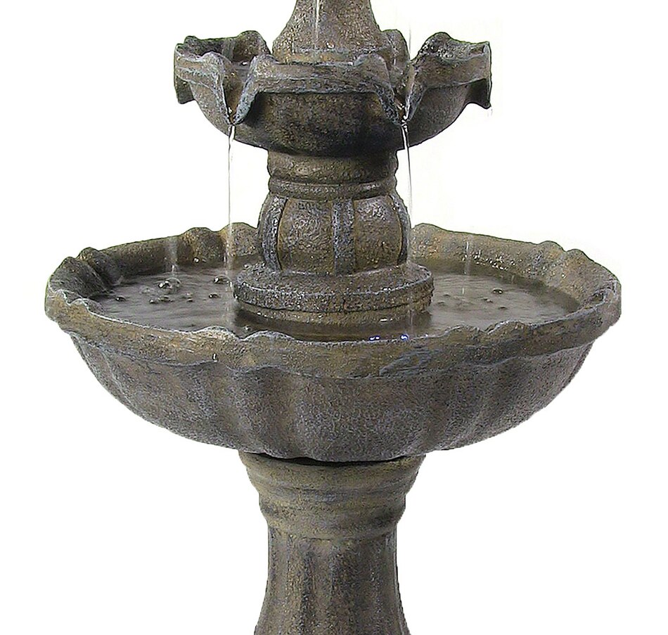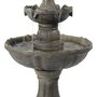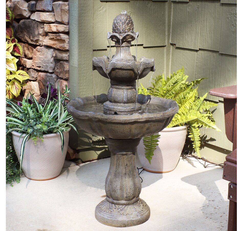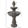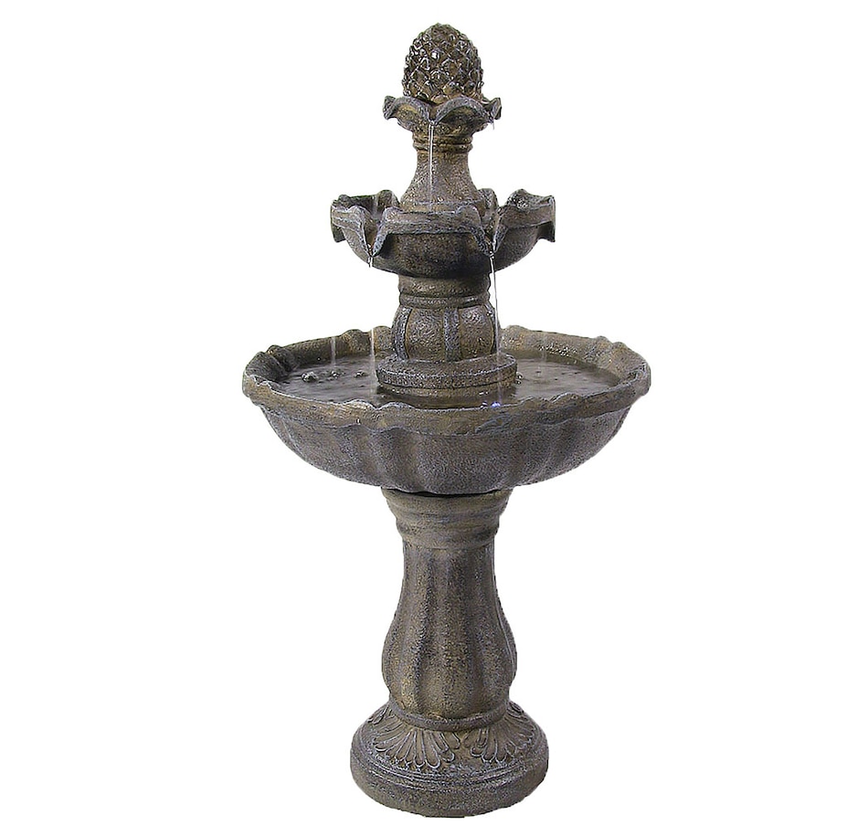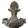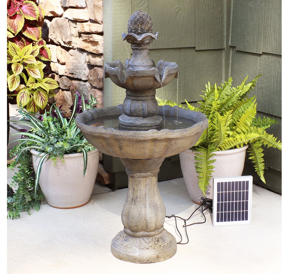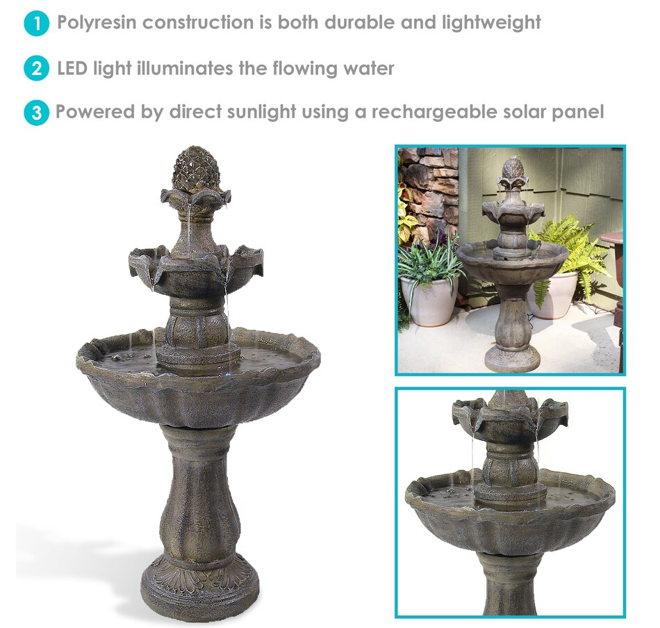 This solar fountain is made of lightweight and durable stone-grey polyresin and fiberglass and features a pineapple topper with two stacked basins. Water flows from the top pineapple into the central basin, which fills and then overflows into the largest bottom pool before circulating. This fountain operates via solar power or the battery. In bright sunlight, the panel powers the pump while the battery pack collects and stores a charge. When cloudy or nighttime, the battery pack will activate and power the unit; when fully charged, it can do so for as many as 4 hours. When the batteries are depleted, the system automatically attempts to draw power from the panel and will resume running once the sun come out. Enhance the patio, deck, yard, garden, front porch, or other outdoor area effortlessly with this fountain, sure to bring stunning views and soothing sounds.
