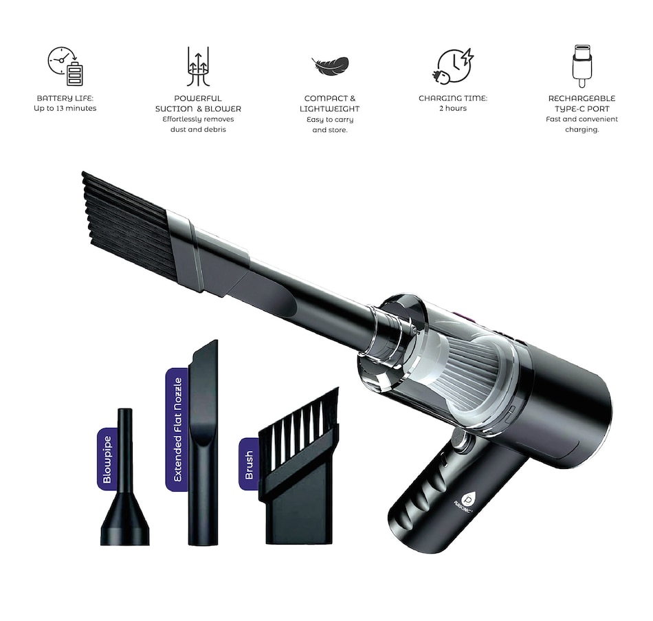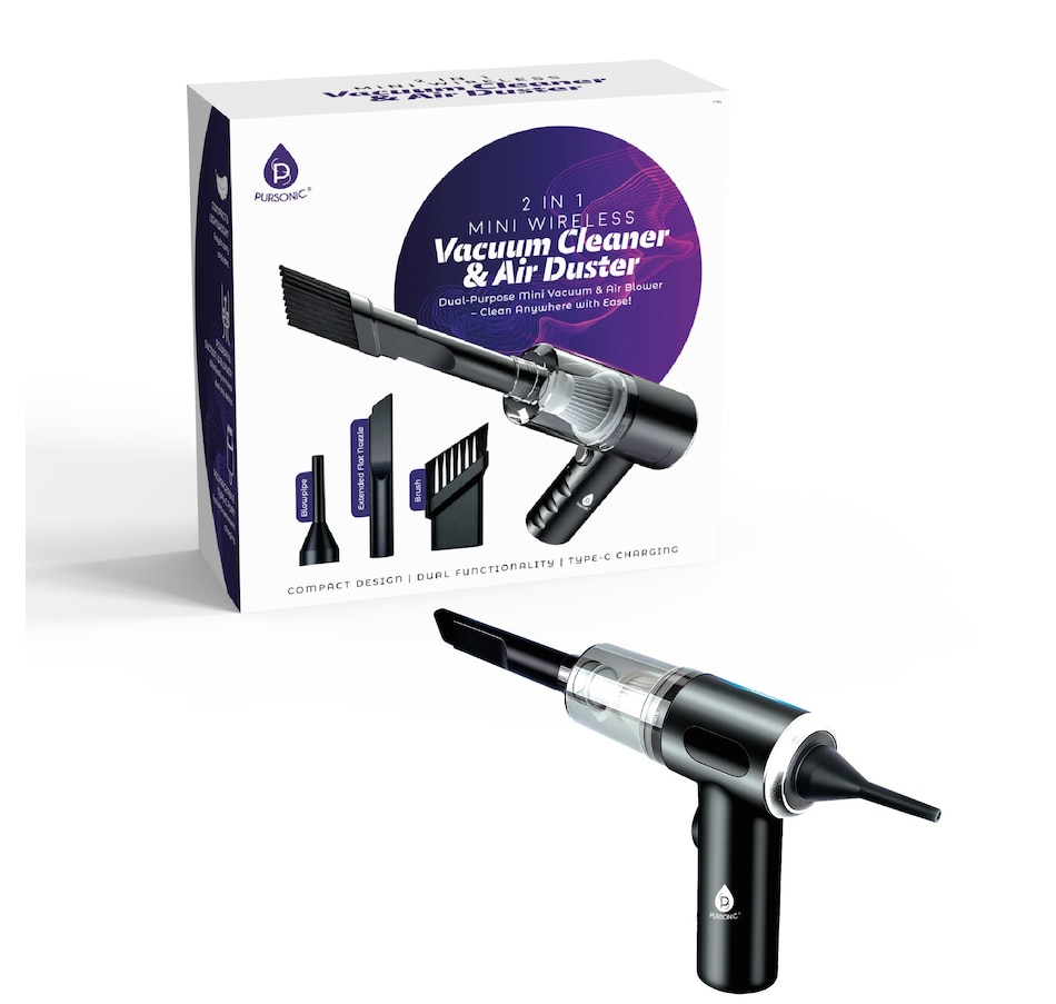 Keep your space spotless with the 2-in-1 Mini Wireless Vacuum Cleaner and Air Duster! Designed for versatility and convenience, this compact yet powerful tool effortlessly switches between vacuuming and blowing, making it perfect for cleaning dust, debris, and crumbs from hard-to-reach places. Whether you're tidying up your car, keyboard, or pet area, this portable device gets the job done with ease.Key Features:✅ Dual-Function Cleaning – Switch between vacuum mode for powerful suction and air duster mode to blow away dirt and debris.✅ Compact & Lightweight – Easy to carry, store, and use on the go. Perfect for home, office, and travel.✅ Powerful Suction & Blower – Effectively removes dust, pet hair, and small debris with strong airflow.✅ Rechargeable & Convenient – Features a Type-C charging port for fast and easy recharging, ensuring you're always ready to clean.Perfect For:Cars – Remove crumbs, dust, and pet hair from seats, dashboards, and vents.Computers & Keyboards – Keep electronics dust-free without damaging delicate components.Pet Areas – Clean up pet fur and dander effortlessly.Small Spaces & Hard-to-Reach Areas – Ideal for cleaning between couch cushions, inside drawers, and more!Why Choose This 2-in-1 Vacuum & Air Duster?✔ Wireless & Portable – No cords, no hassle!✔ Eco-Friendly Alternative – Say goodbye to disposable compressed air cans.✔ Quick & Efficient – Saves time while keeping your space clean.What’s Included?1 x 2-in-1 Mini Wireless Vacuum Cleaner & Air Duster1 x Type-C Charging Cable1 x User ManualTake your cleaning routine to the next level with this compact, rechargeable, and ultra-efficient cleaning tool! Perfect for car owners, pet lovers, and tech enthusiasts alike.Order yours today and enjoy a dust-free space with ease! 🚀