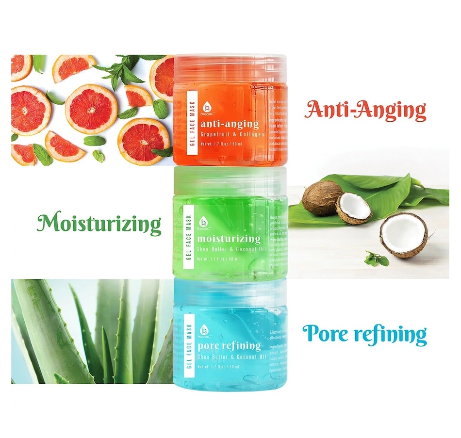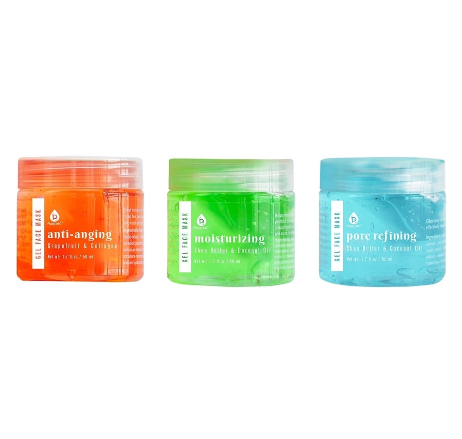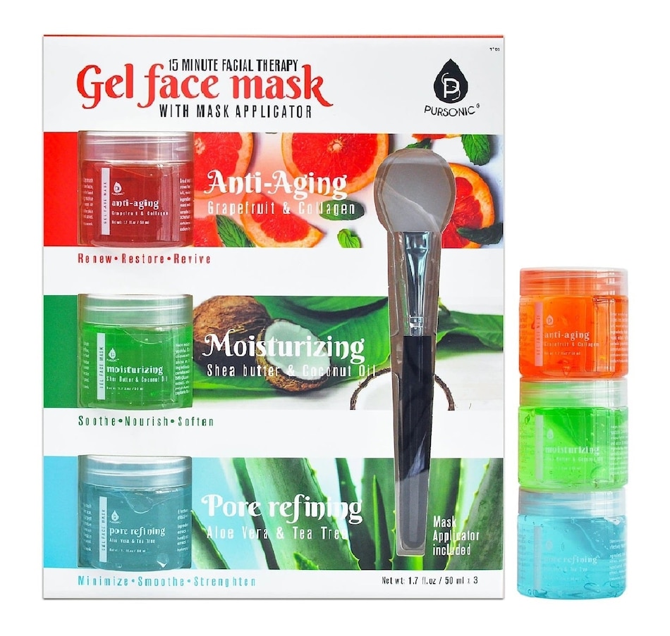 This value pack includes 3 gel face masks. Grapefruit & Collagen, Shea Butter & Coconut Oil, Aloe Vera & Tea Tree, each with three distinct purposes. These masks will cleanse and as well as glow up your skin. Features:Grapefruit & Collagen Gel Mask for Anti-AgingThe anti-oxidants in grapefruit will fight free radicals in the skin that can cause lines, wrinkles, discolorations and other blemishes. Collagen can improve skin elasticity, reduce visible wrinkles, and increase blood flow to the skin. Collagen is what keeps our skin from sagging.Shea Butter & Coconut Oil Gel Mask for MoisturizingHigh concentrations of fatty acids and vitamins make shea butter is an ideal cosmetic ingredient for softening skin. Shea butter also has anti-inflammatory and healing properties for your face. It can condition, tone, and soothe your skin. Coconut oil provides antioxidants, moisturizes, minimizes the signs of aging, boosts nutrients and helps to protect your face. Known for lauric acid, it has antimicrobial properties and is known to fight acne-causing bacteria.Aloe Vera & Tea Tree Gel Mask for Pore RefiningThe healing and anti-inflammatory properties of aloe vera help reduce redness and inflammation. It also reduces acne and lightens blemishes. You can also use it on your skin if you have sunburn. Tea tree oil helps with acne and acne scars. Studies have shown that tea tree oil reduces both inflamed and non-inflamed lesions associated with acneHow to Use: Thoroughly clean and dry your face. Dip brush into jar and scoop desired amount. Spread evenly over face, avoiding eyes and lips. Wear mask for 10 to 15 minutes for best results. Make sure to wash off all remaining residue immediately after treatment as leaving on longer can cause an allergic reaction. Refrain from using if you have sensitive skin or are allergic to any ingredients listed in the ingredient panel. Recommended usage: 2 to 3 times a week. Clean brush after every use. Rinse clean with warm water and mild soap. Shake off excess water and gently pat dry brush against a clean towel.  Model Number: FM3AMP