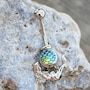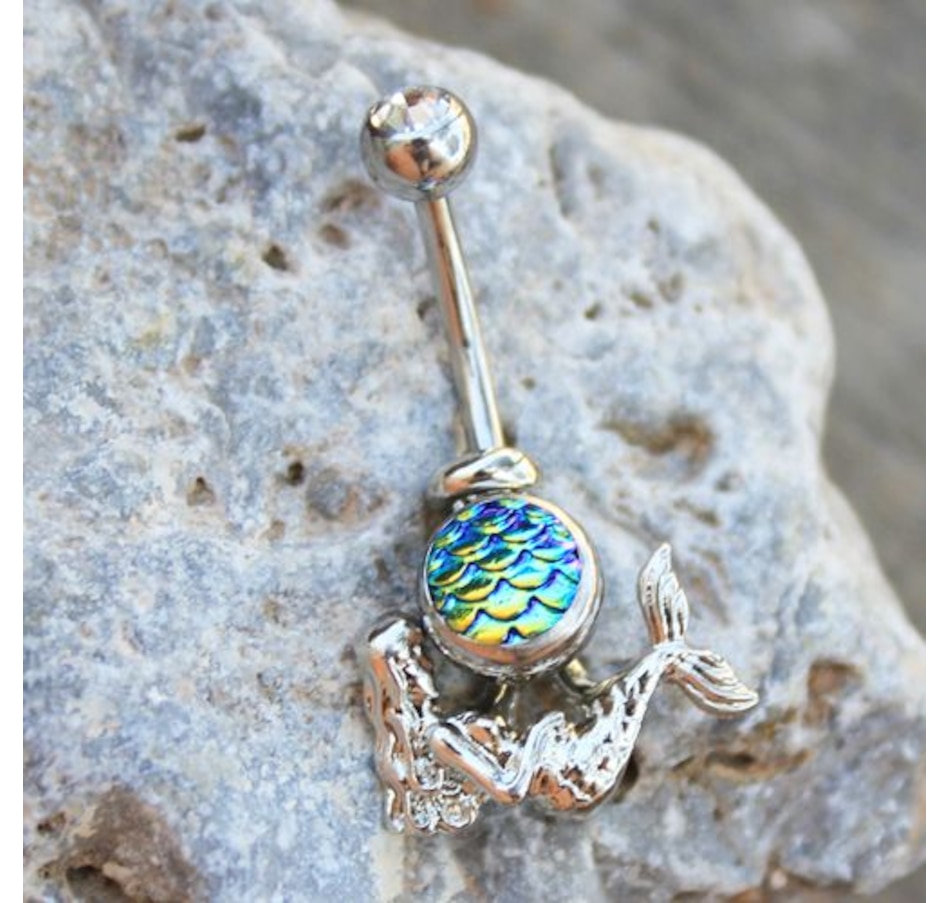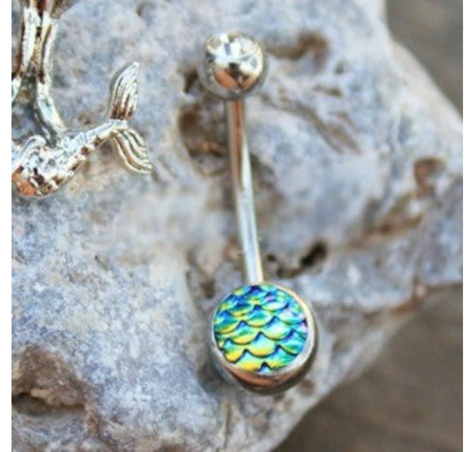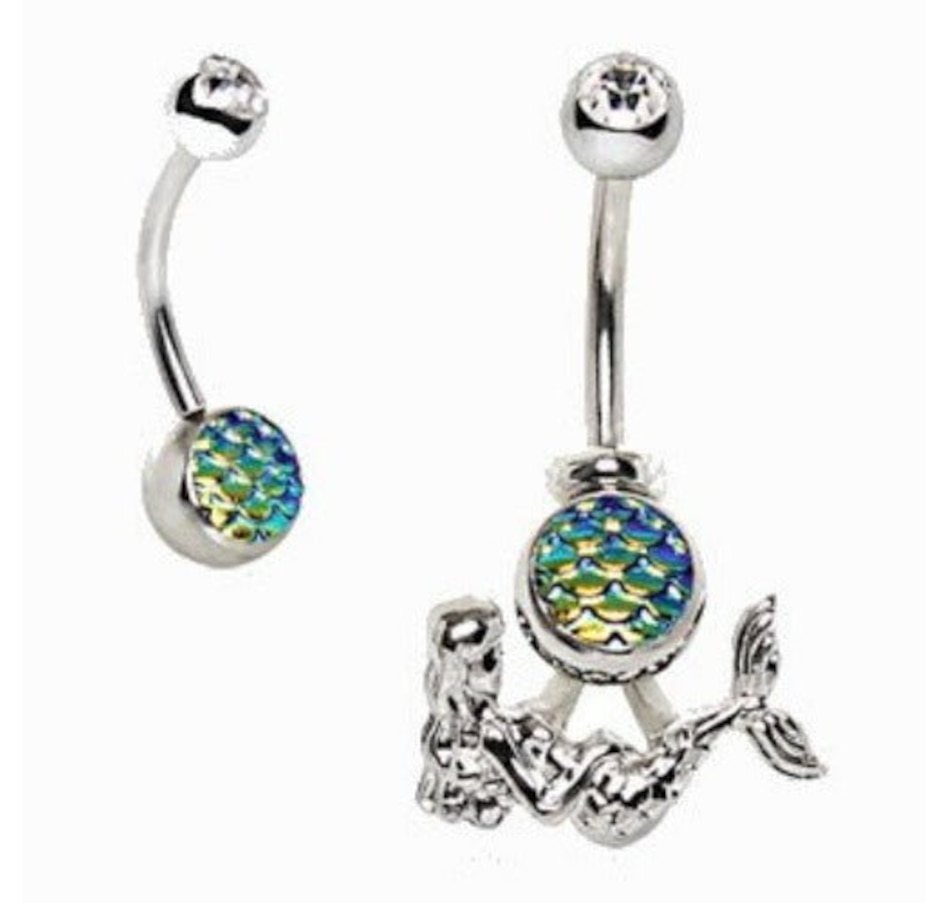 2-in-1 Navel Ring / Belly Button Ring‚Navel Ring with Green Fish Scale Cabochon‚Removal Mermaid design bottom piece‚Detailed design on the Mermaid‚Bar Thickness : 14GA | 1.6mm‚Bar Length : 1/2" | 12.5mm‚Wearable Length with removal piece : 7/16" | 11mm‚Top Ball Size : 5mm‚Bottom Ball Size : 8mm‚Material : 316L Stainless Steel, Zinc Alloy, Fish Scale Cabochon, Cubic Zirconia