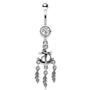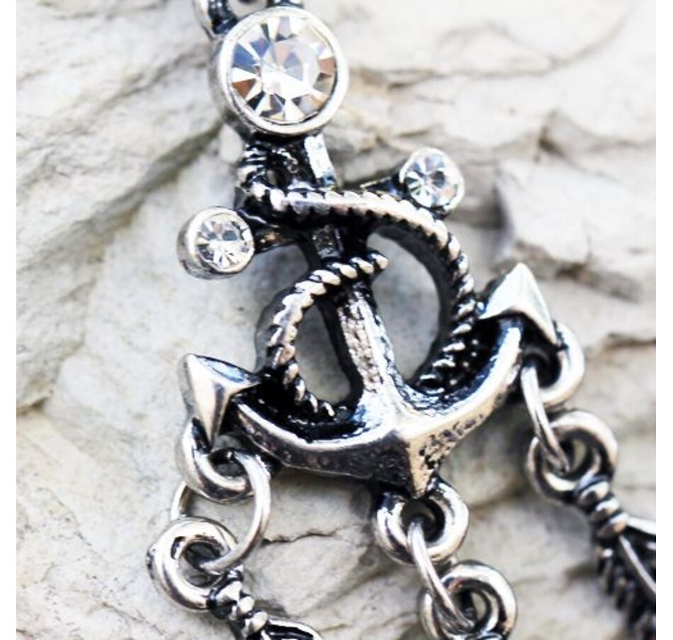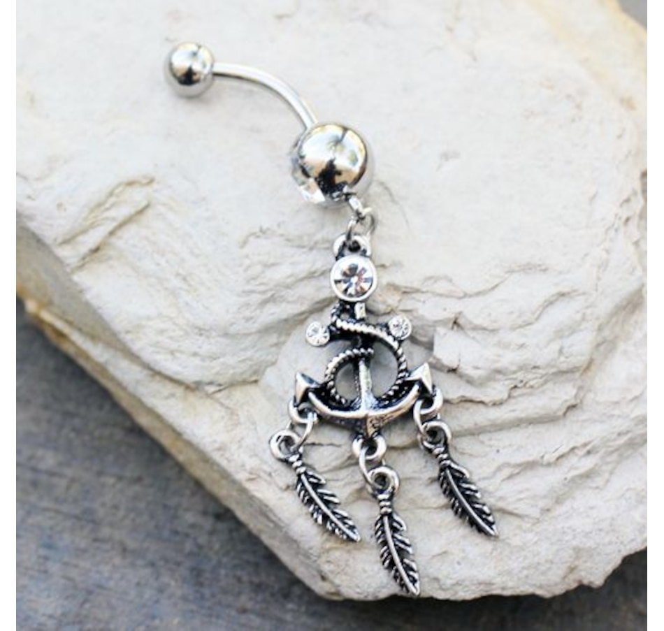 Navel Ring / Belly Button Ring with Anchor and Feather Dangle‚Three Clear CZ on the Anchor with a rope around it‚Three feathers individually dangle from the anchor‚Press fit (Bezel Set) Clear CZ ball on the Navel Ring‚Bar Thickness : 14GA | 1.6mm‚Bar Length : 3/8" | 10mm‚Ball Size : 5mm (top) x 8mm (bottom)‚Dangle Size : 14 x 31mm‚Material : 316L Stainless Steel, Zinc Alloy, Cubic Zirconia