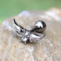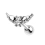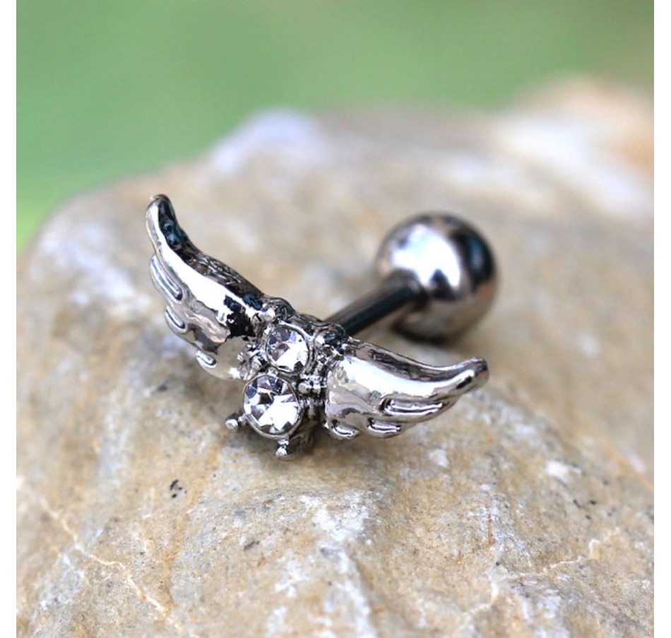 Cartilage / Tragus Ring with an Angel Wing Design‚Two round Clear CZ in the center of wings‚Bar Thickness : 16GA | 1.2mm‚Bar Length : 1/4" | 6mm‚Angel Wing Size : 12 x 5.5mm‚Ball Size : 4mm‚Thread Type : Externally Threaded‚Material : 316L Stainless Steel, Zinc Alloy, Cubic Zirconia