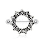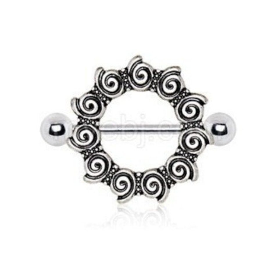 316L Stainless Steel nipple jewelry‚Multiple spiral design on the shield‚Partially plated in Black for an antique jewelry look‚Two rings in the back of shield for a barbell to be attached‚Ring Size (Wearable Size) : 1/2" | 12.5mm‚Bar Thickness : 14GA | 1.6mm‚Bar Length : 3/4" | 19mm‚Ball Size : 5mm‚Material : 316L Stainless Steel