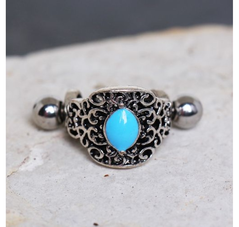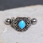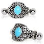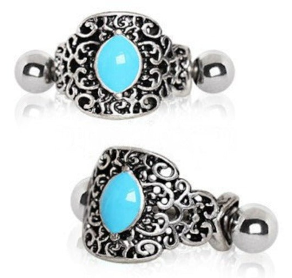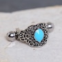 Cartilage Cuff Earring with an Ornate Design‚Oval shape Aqua color Enamel‚Jewelry is partially plated in Black for a contrast‚Barbell Thickness : 16GA | 1.2mm‚Barbell Length : 1/2" | 12mm‚Cuff Size : 12 x 10mm‚Material : 316L Stainless Steel, Zinc Alloy, Enamel