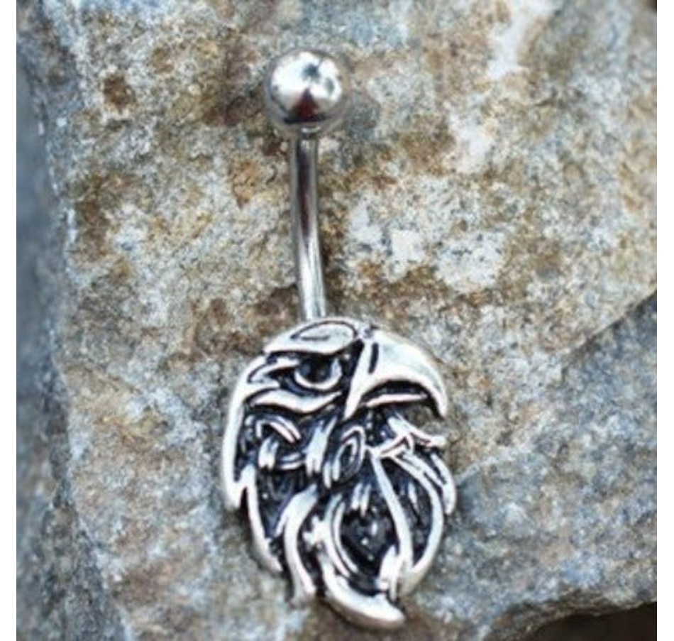 Navel Ring / Belly Button Ring with Eagle Design‚Detailed design of Bald Eagle head‚Black CZ as an eye of the eagle‚Bar Thickness : 14GA | 1.6mm‚Bar Length : 3/8" | 10mm‚Eagle Size : 13(L) x 17.5(W)mm‚Thread Type : Externally Threaded‚Material : 316L Stainless Steel, Zinc Alloy, Cubic Zirconia