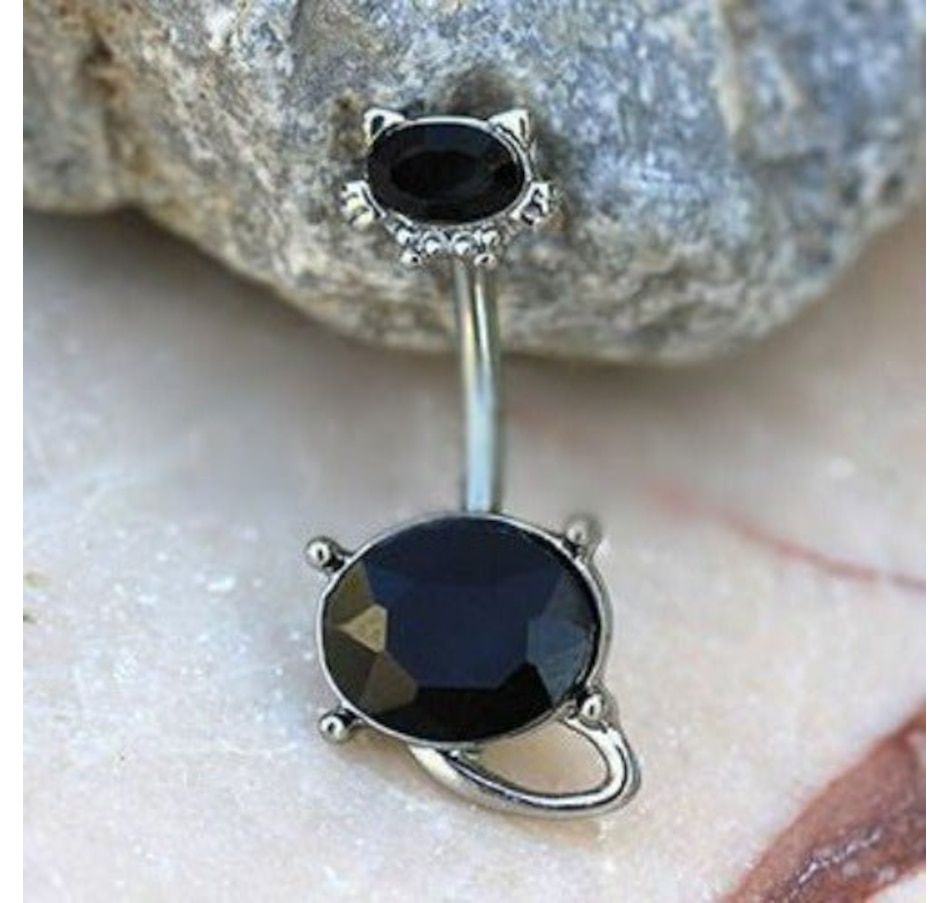 Navel Ring / Belly Button Ring with a cat design‚Large Black oval shaped CZ on top and bottom‚Detailed design of cat's ears, whiskers, legs, tail, and a bow tie‚Bar Thickness : 14GA | 1.6mm‚Bar Length : 3/8" | 10mm‚Total Jewelry Size : 11(L) x 26.5(W)mm‚Thread Type : Externally Threaded‚Material : 316L Stainless Steel, Zinc Alloy, Cubic Zirconia