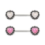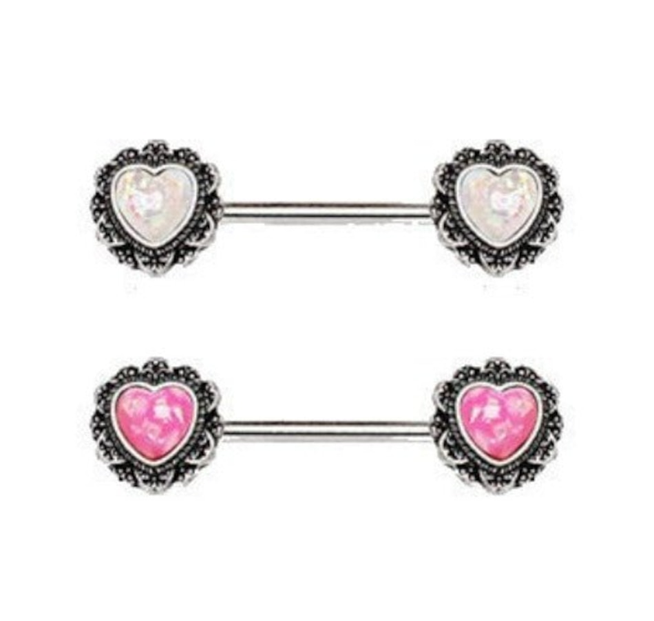 316L Stainless Steel Nipple Jewelry‚Colorful heart shaped synthetic opal‚Black and Gold plating for an antique look‚One side is fixed‚Thickness : 14GA | 1.6mm‚Length : 9/16" | 14mm‚Heart Size : 10mm‚Material : 316L Stainless Steel, Synthetic Opal*Choose Single or a Pair