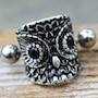 Cartilage Cuff Earring with an Owl design‚Much details on the owl‚Black CZ on the eye‚Jewelry is partially plated in Black for a contrast‚Barbell Thickness : 16GA | 1.2mm‚Barbell Length : 1/2" | 12.5mm‚Cuff Size : 11 x 10 x 13mm‚Ball Size : 4mm‚Material : 316L Stainless Steel, Zinc Alloy, Cubic Zirconia