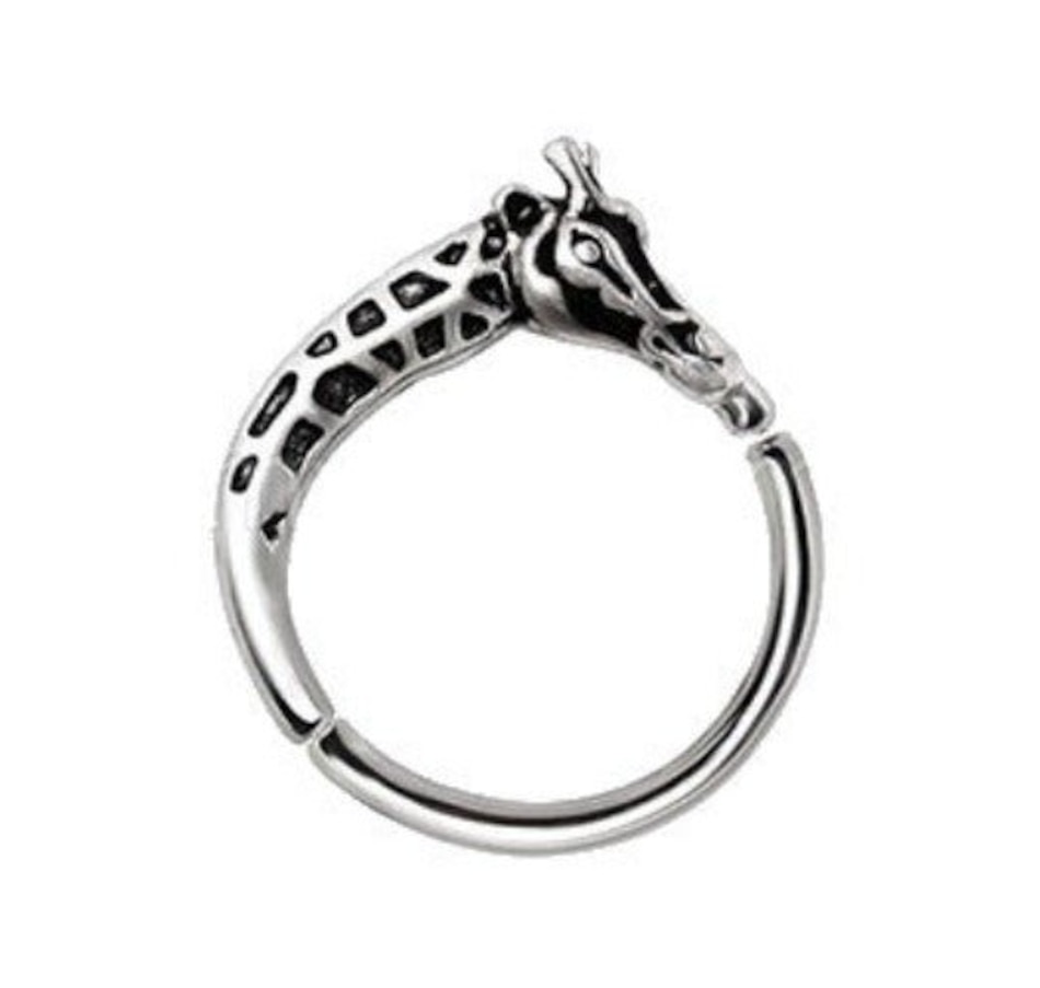 Detailed design of giraffe with Black accents‚Jewelry is Silver plated‚Seamless Ring can be used as Cartilage Earring, Lip Ring, and much more‚Ring Thickness : 16GA | 1.2mm‚Ring Inner Diameter : 3/8" | 10mm‚Material : Silver Plated 316L Stainless Steel, Zinc Alloy‚ *Sold in Singles