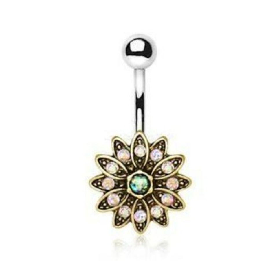 *Navel Ring / Belly Button Ring with a golden floral design‚Gold plated flower is decorated with multiple Aurora Borealis CZ and Blue Synthetic Opal Stone‚Flower design is partially plated in Black for an antique appearance‚Flower Size : 16x16mm‚Bar Thickness : 14GA / 1.6mm‚Bar Length : 3/8" | 10mm‚Ball Size : 5mm‚Material : 316L Stainless Steel, Plated Zinc Alloy Steel, Cubic Zirconia, Synthetic Opal Stone