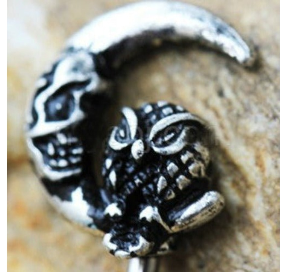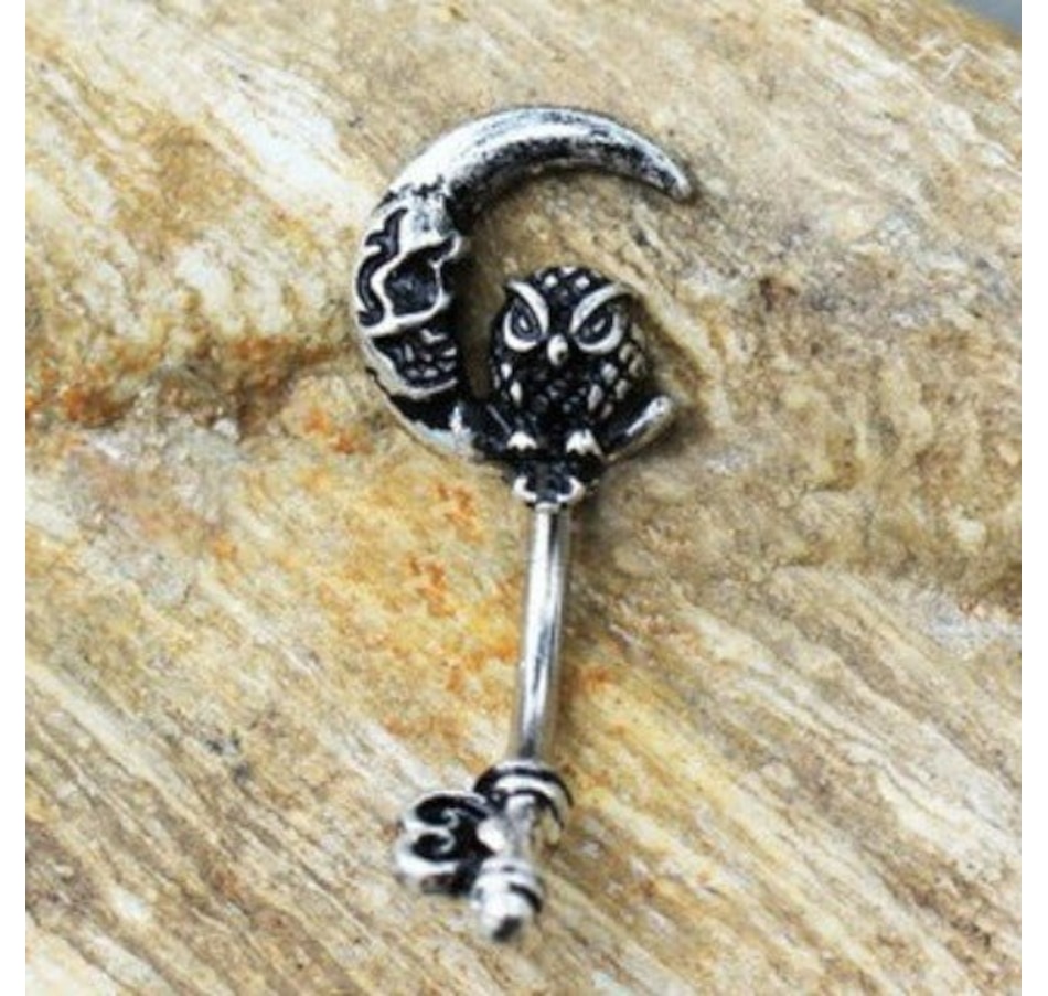 Belly Button Rings / Navel Rings with Owl on the Moon Skeleton Key Design‚Gothic Owl sitting on the crescent moon‚Skeleton Key shape top down navel ring‚Jewelry is partially plated in Black‚Bar Thickness : 14GA | 1.6mm‚Bar Length : 3/8" | 10mm‚Flower Field Shield Size : 12(L) x 31(W)‚Thread Type : Externally Threaded‚Material : 316L Stainless Steel, Zinc Alloy